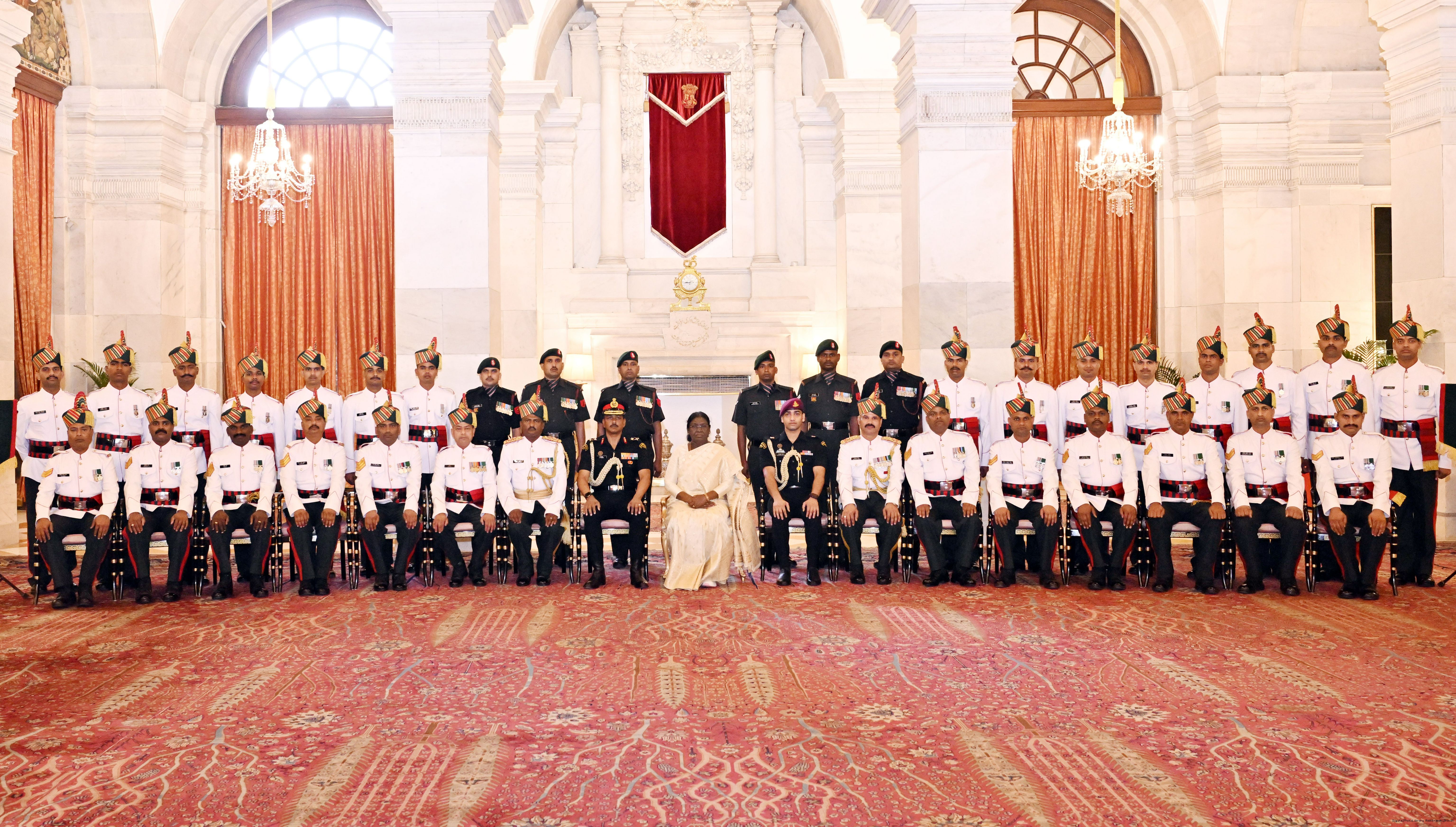 The President of India, Smt Droupadi Murmu posing a group photograph with Military Band personnel (Bihar Regimental Centre) attached with Rashtrapati Bhavan on March 31, 2026.