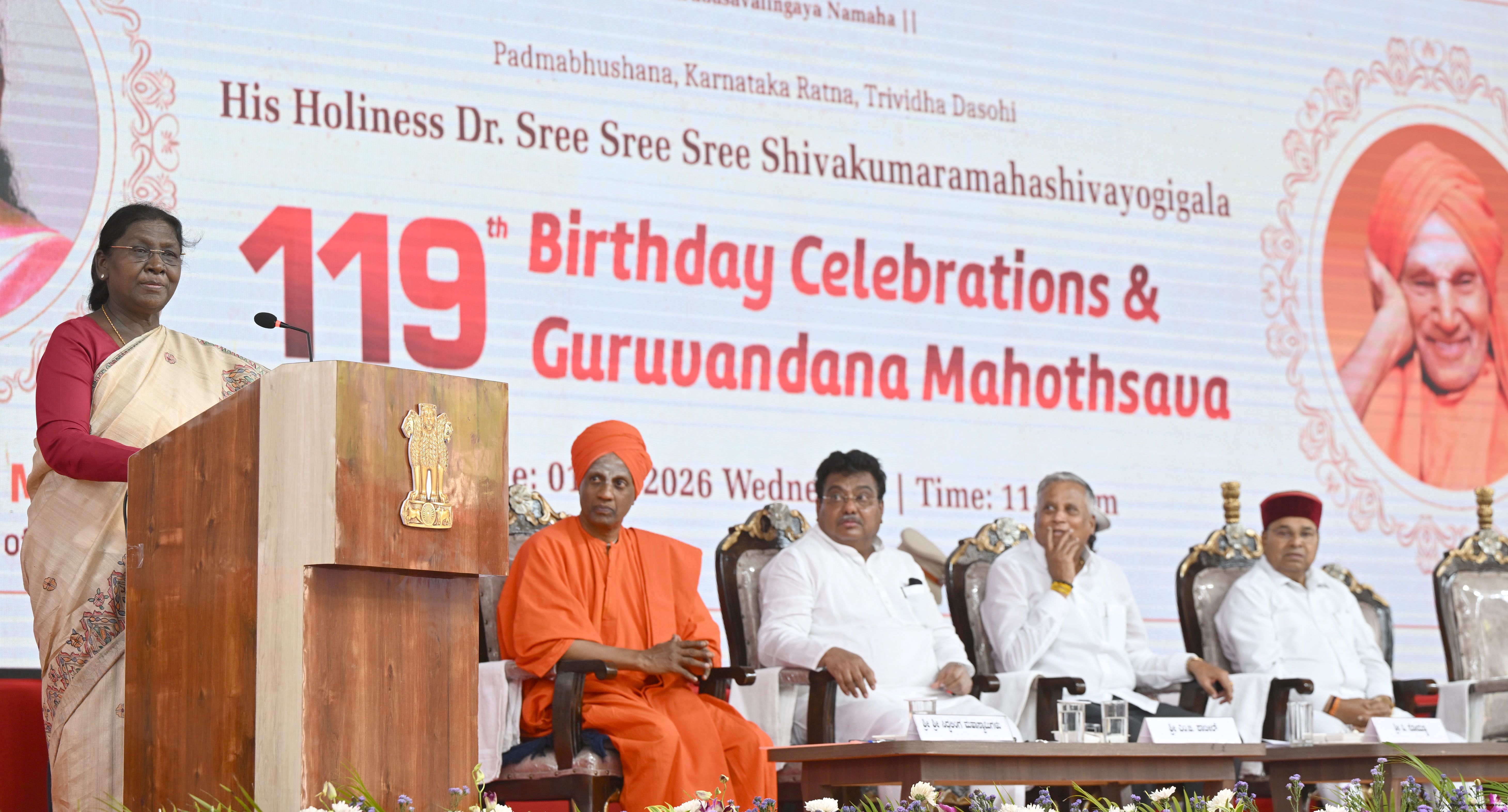 The President of India, Smt Droupadi Murmu graced the 119th birthday celebrations and Guruvandana mahotsava of Dr Sree Sree Sivakumara Mahaswamiji at Sree Siddaganga Math, Tumakuru, Karnataka on April 1, 2026.