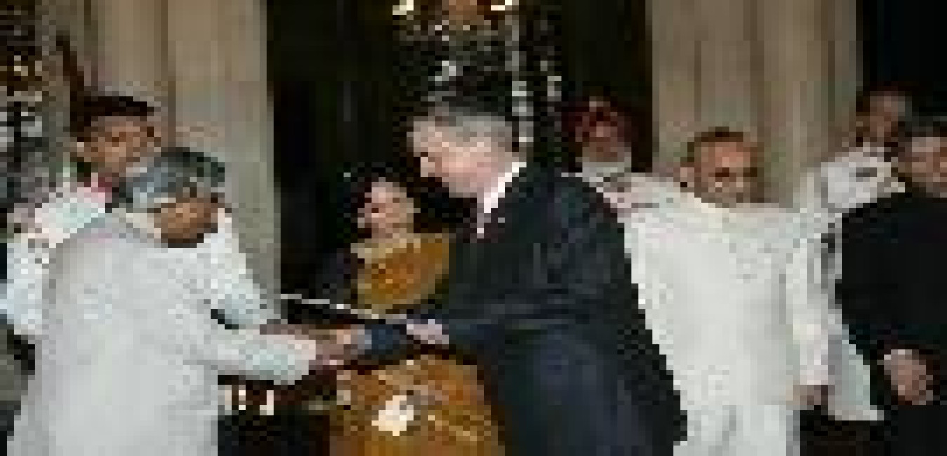 The Ambassador-Designate of the Republic of Moldova to India, HE Mr Chilari Efim presenting his credentials to the President of India, Dr A P J Abdul Kalam at the Ashok Hall of Rashtrapati Bhavan in New Delhi on April 26, 2005