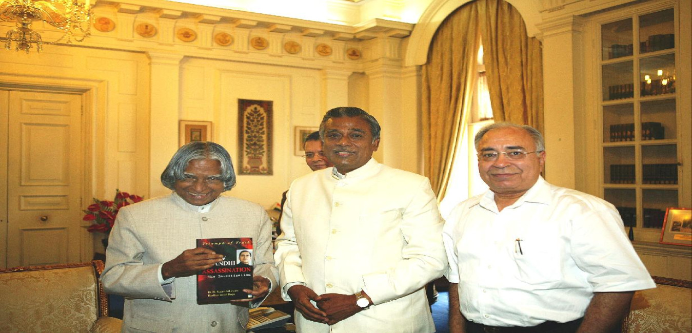 The President of India, Dr A P J Abdul Kalam presenting the Book the Triumph of Truth Shri D R Karthikeyan at the Rashtrapati Bhavan in New Delhi on April 05, 2004