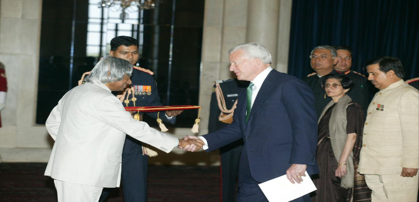 The Ambassador-Designate of United States of America to India, HE Dr David Campbell Mulford presenting his credentials to the President of India, Dr A P J Abdul Kalam at the Ashok Hall of Rashtrapati Bhavan in New Delhi on Feb 20, 2004