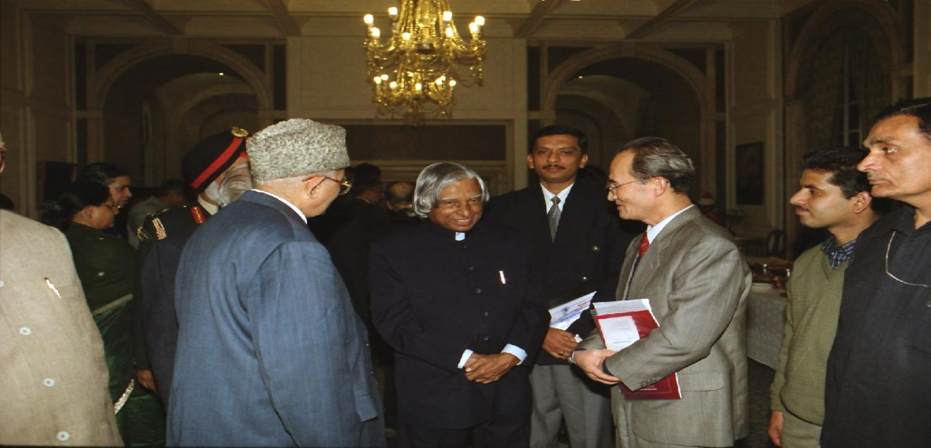 The President of India, Dr A P J Abdul Kalam receiving a Copy of the "Transformation of India as Knowledge Superpower - Strategies for Action" from the Member of Planning Commission, Dr K Venkatasubramaniam at the Yellow Drawing Room of Rashtrapati Bhavan on Dec 11, 2002