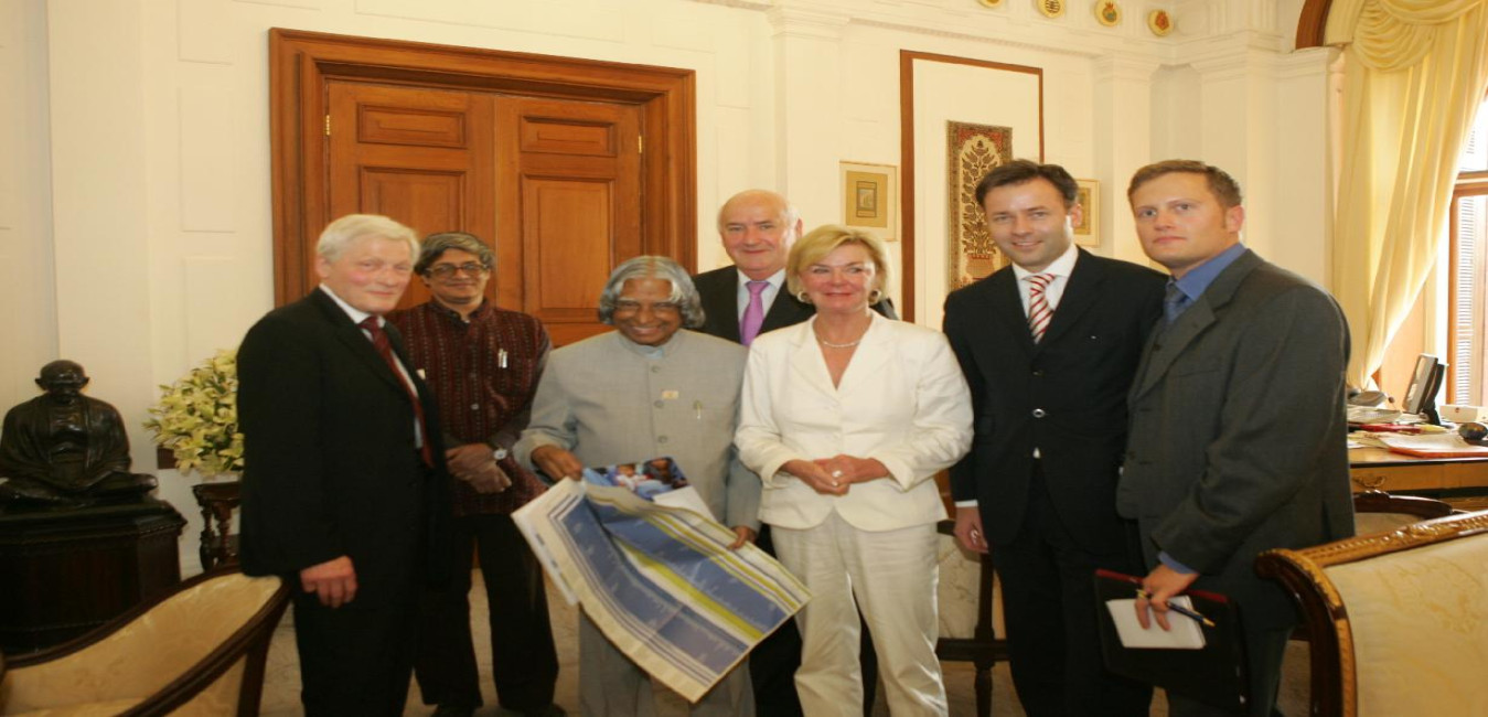 The President of India, Dr A P J Abdul Kalam with Ms Liz Mohn, Deputy Chairperson, Executive Board and others from Bertelsmann Stiftung (Foundation), Gutersloh, Germany alongwith Shri Bibek Debroy, Director, Rajiv Gandhi Institute of Contemporary Studies at Rashtrapati Bhavan in New Delhi on Nov 25, 2005