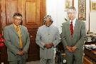 The President of India, Dr A P J Abdul Kalam with the Former Prime Minister of Sweden and Special Envoy of UN Secretary General & Chairman of World Council for Corporate Governance (WCFCG), Dr Ola UIIsten alongwith the President of WCFCG (UK), Dr Madhav Mehra at Rashtrapati Bhavan in New Delhi on June 16, 2005