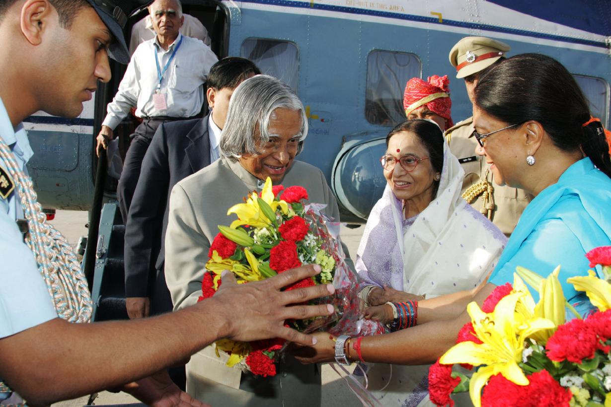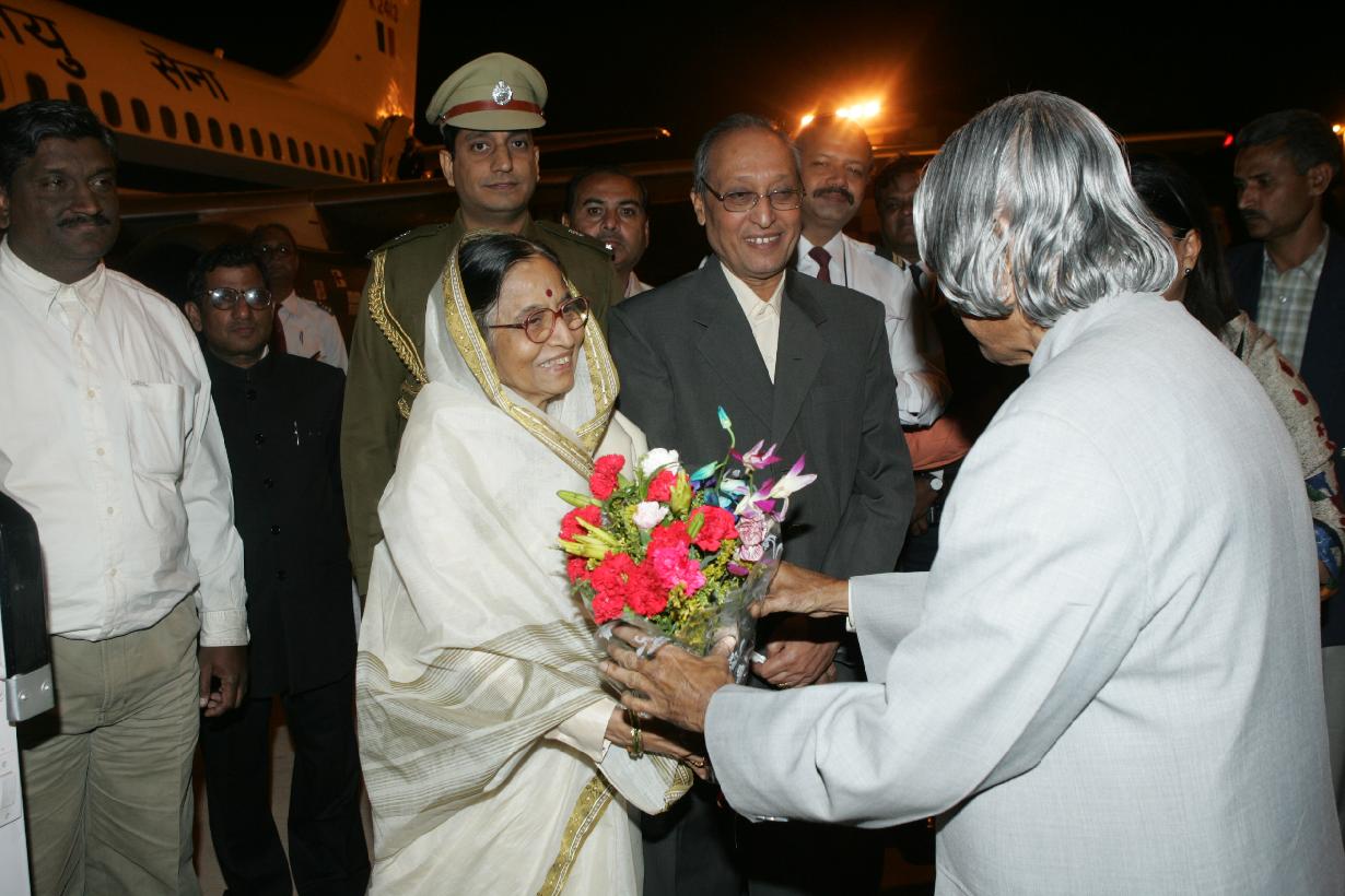 The President of India, Dr A P J Abdul Kalam being received by the Governor of Rajasthan, Smt Pratibha Devisingh Patil at Jaipur Airport in Rajasthan on Nov 17, 2005