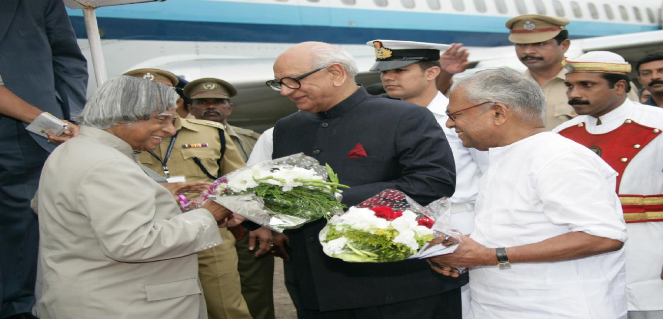 The President of India, Dr A P J Abdul Kalam being received by the Governor of Kerala, Shri R L Bhatia and the Chief Minister of Kerala, Shri V S Achuthanandan at Thiruvananthapuram in Kerala on Sep 21, 2006