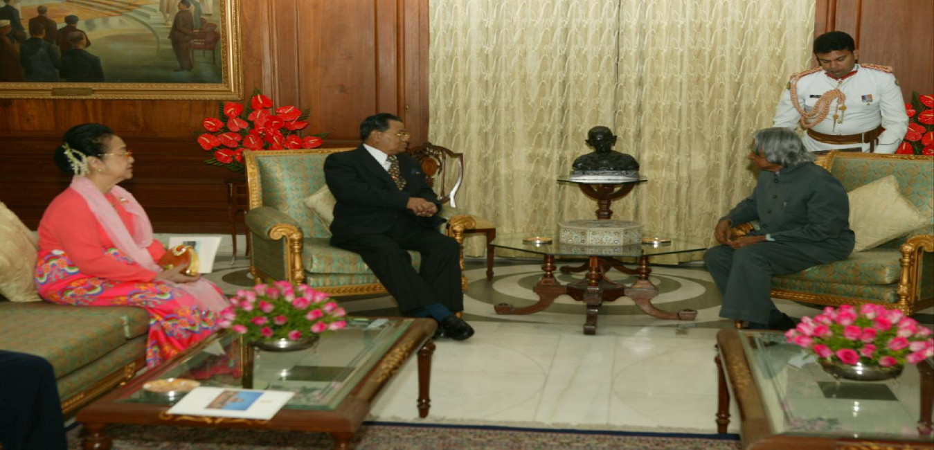 The Chairman, SPDC of Union of Myanmar, HE Senior General Than Shwe and Daw Kyaing Kyaing calling on the President of India, Dr A P J Abdul Kalam at the North Drawing Room of Rashtrapati Bhavan in New Delhi on Oct 25, 2004