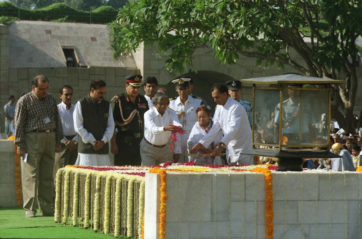 The President of India, Dr A P J Abdul Kalam paying homage at the Samadhi of Mahatma Gandhi on the occasion of Mahatma Gandhi's 133rd Birth Anniversary at Rajghat in New Delhi on Oct 02, 2002