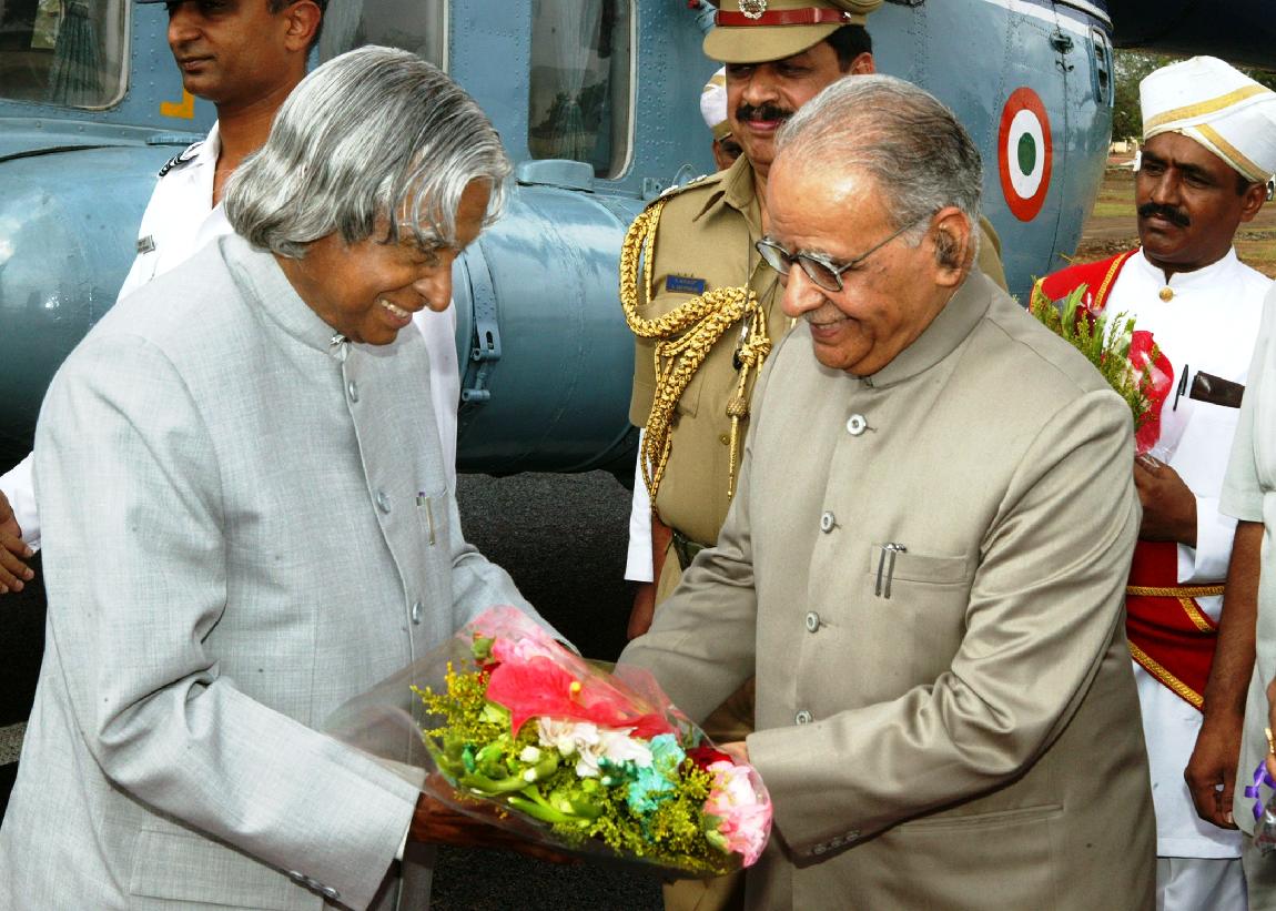 The President of India, Dr A P J Abdul Kalam being welcomed by the Governor of Karnataka, Shri T N Chaturvedi at Police Headquarters Helipad at Gulbarga in Karnataka on Sep 23, 2004