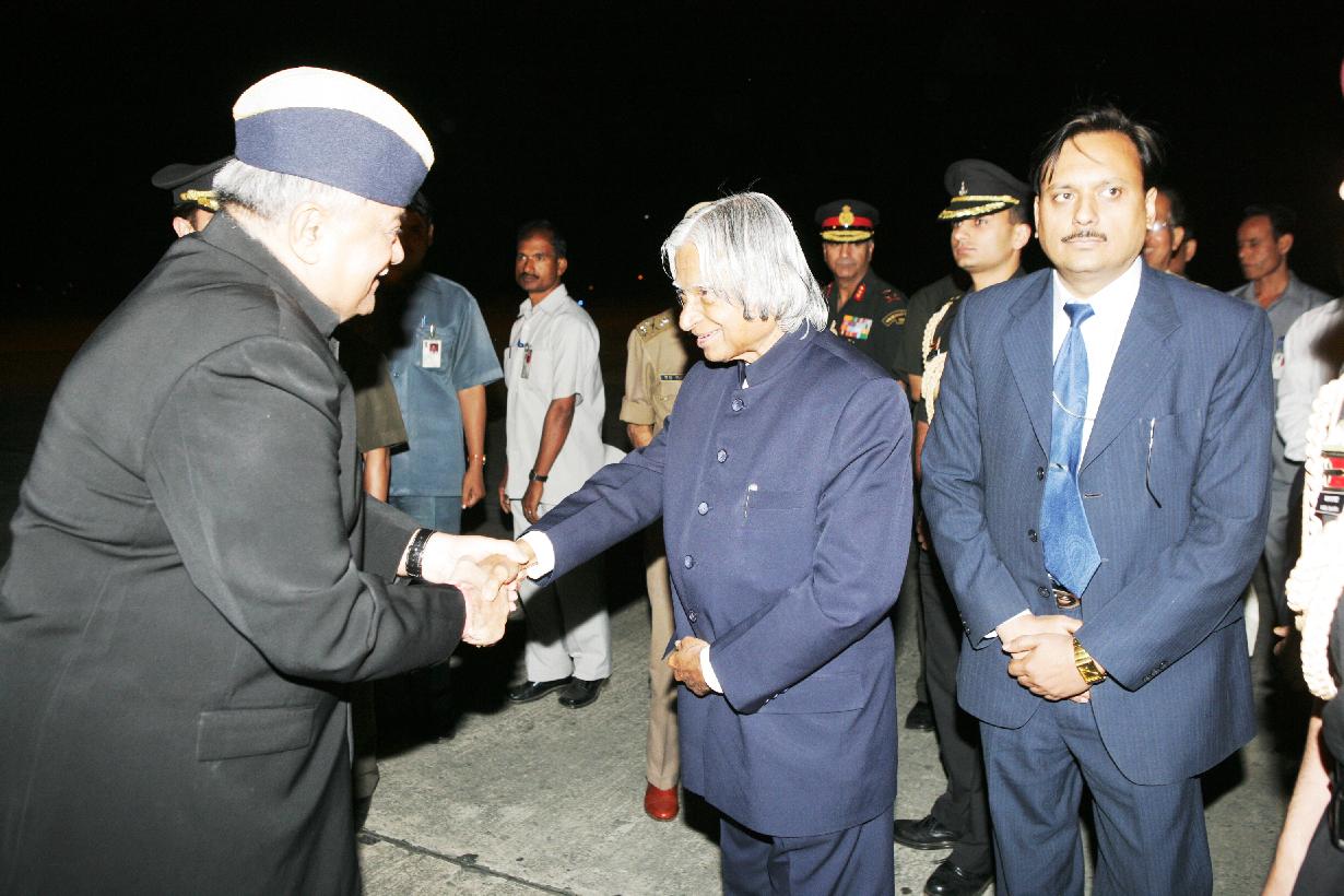 The President of India, Dr A P J Abdul Kalam being welcomed by the Chief Minister of Assam, Shri Tarun Gogoi at Guwahati Airport in Assam on March 16, 2007