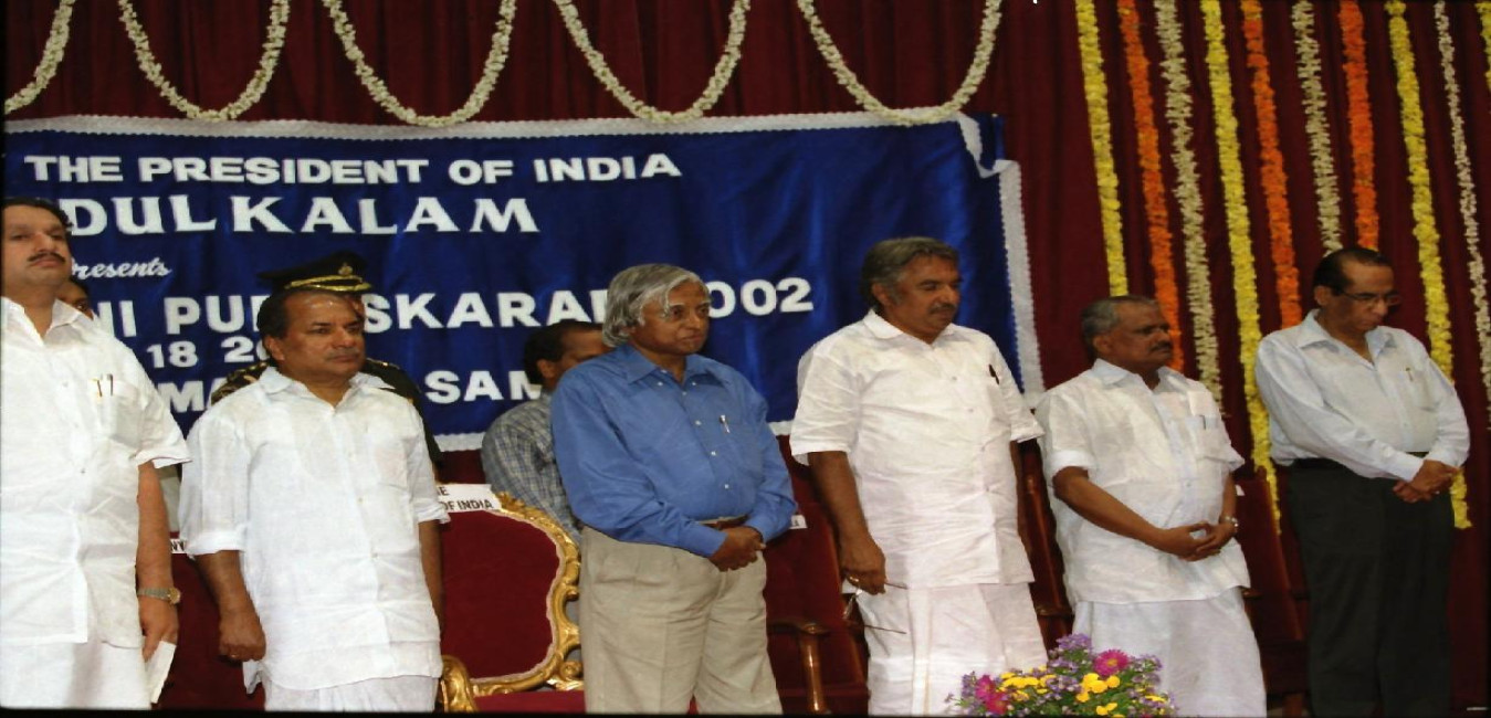 The President of India, Dr A P J Abdul Kalam presenting the Swadesabhimani Puraskar 2002 to Shri V K Madhavan Kutty at Kanakakunnu in Kerala on Nov 18, 2002