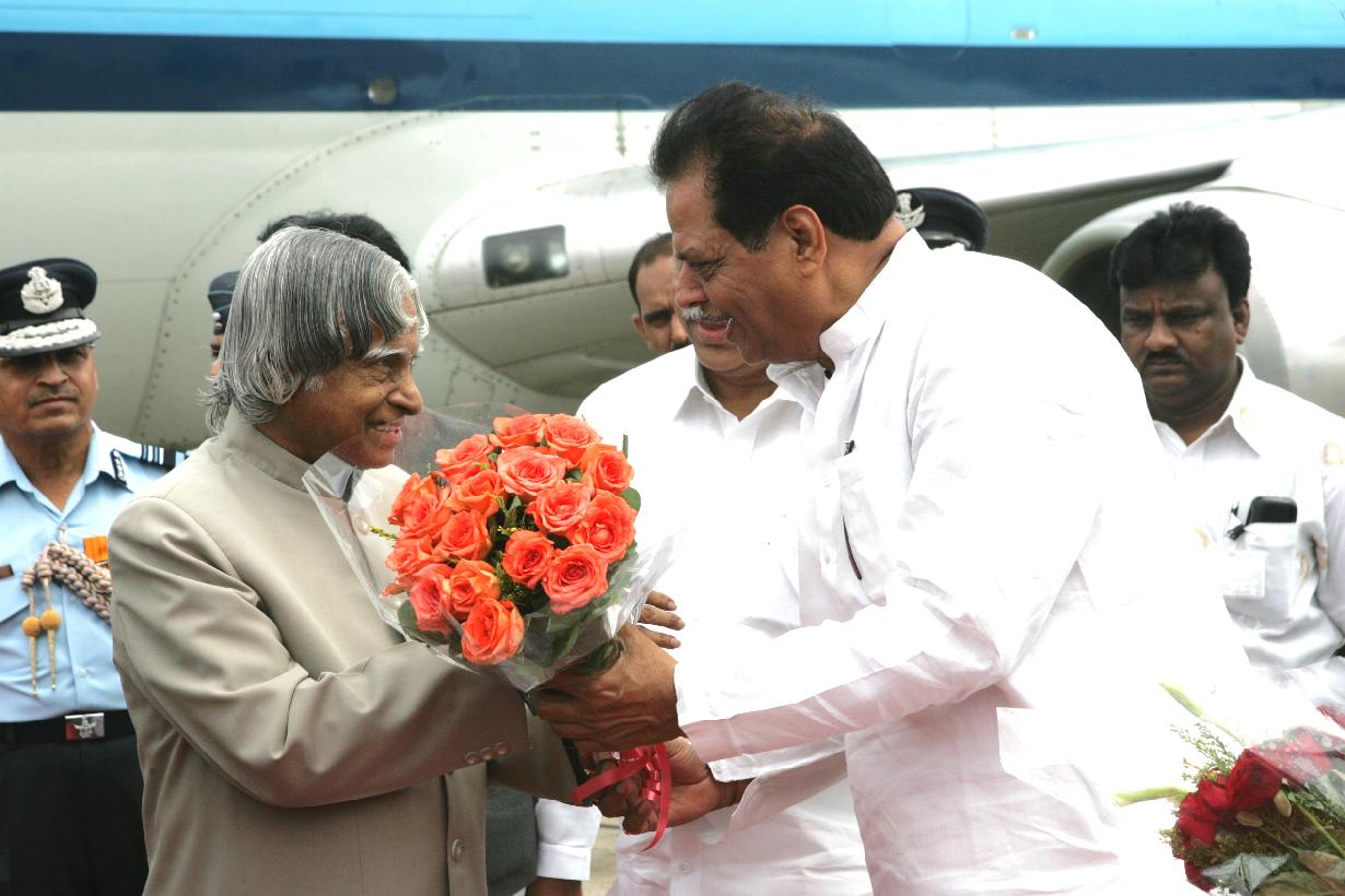 The President of India, Dr A P J Abdul Kalam being welcomed by the Chief Minister of Maharashtra, Shri Vilasrao Deshmukh at Pune Airport in Maharashtra on Jan 16, 2007