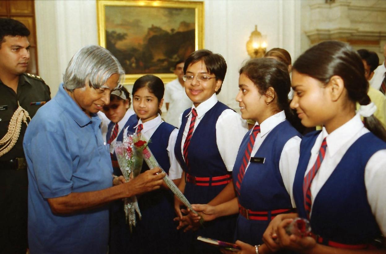 The Students from Lovely Public Senior Secondary School East Delhi calling on the President of India, Dr A P J Abdul Kalam at the Yellow Drawing Room of Rashtrapati Bhavan in New Delhi on July 25, 2003