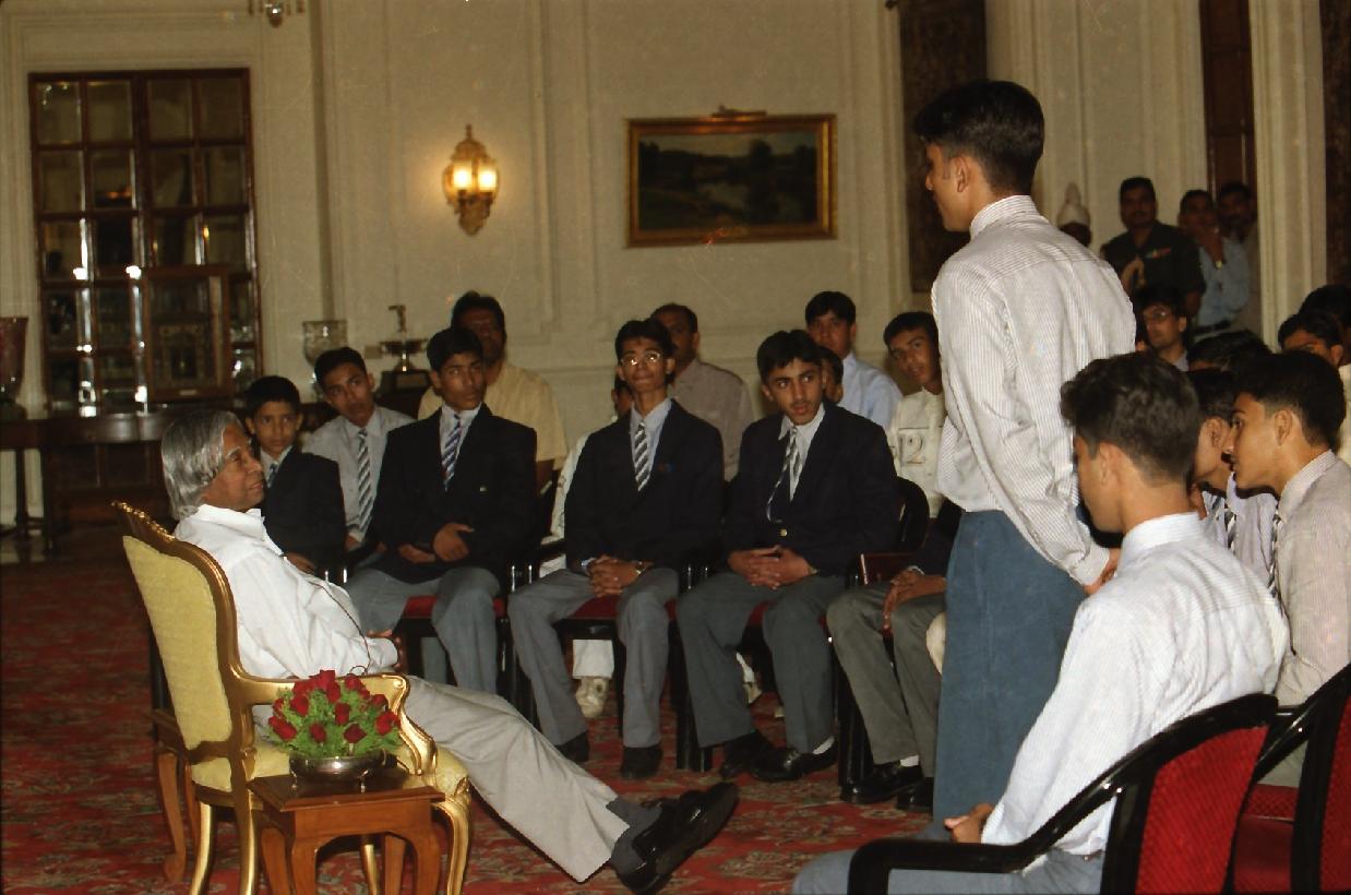 The President of India, Dr A P J Abdul Kalam meeting with the Students and Staff from St Michael's Higher Secondary School, Bhopal at the Yellow Drawing Room of Rashtrapati Bhavan in New Delhi on Sep 27, 2002