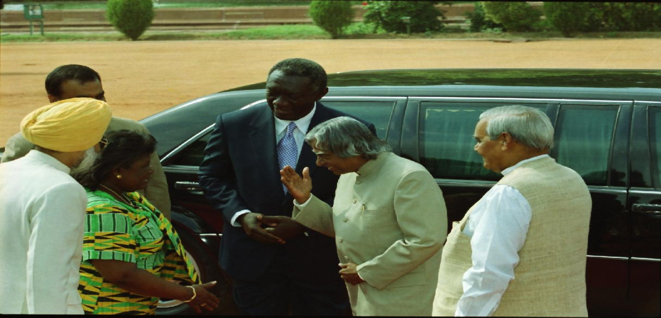 The President of the Republic of Ghana, His Excellency Mr John Agyekum Kufuor and his wife Mrs Theresa Kufuor calling on the President of India, Dr A P J Abdul Kalam at the North Drawing Room of Rashtrapati Bhavan in New Delhi on Aug 05, 2002