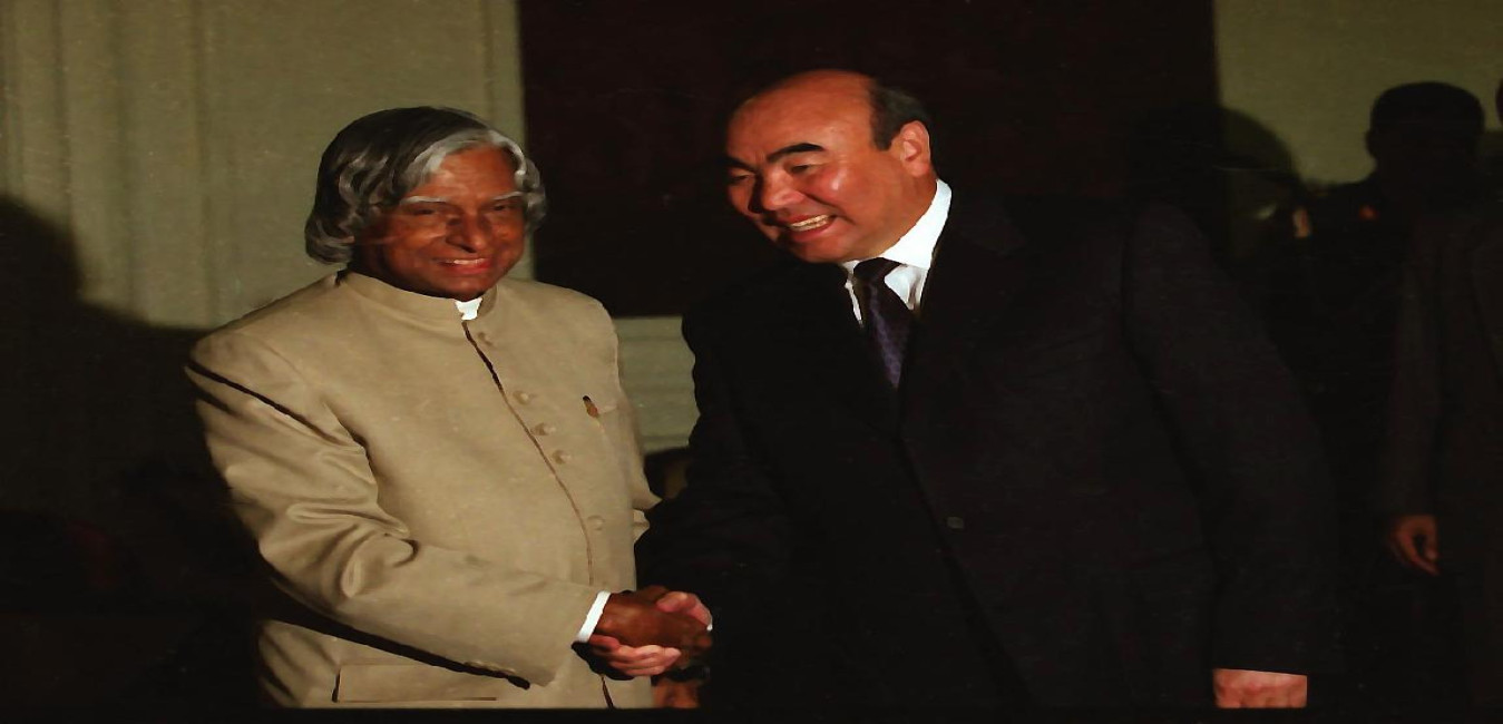 The President of India, Dr A P J Abdul Kalam interacting with the President of the Republic of Kyrgyzstan, His Excellency Mr Askar Akaev at the Morning Room of Rashtrapati Bhavan in New Delhi on Aug 07, 2002
