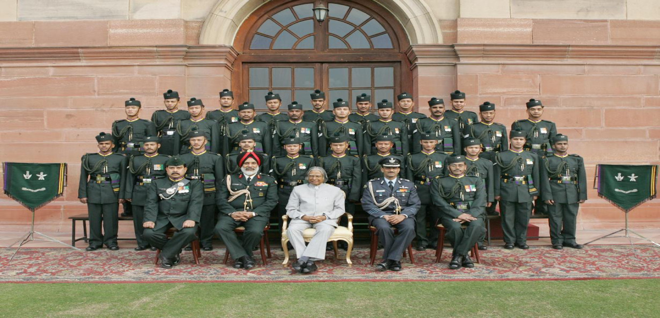 The President of India, Dr A P J Abdul Kalam posing for a Group photograph with the 39 GTC Varanasi Regt Centre Brass Band at the East Lawn of Rashtrapati Bhavan in New Delhi on Dec 29, 2004