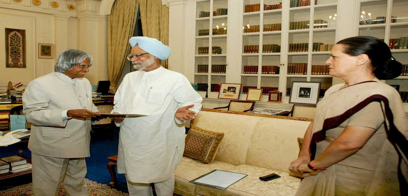 The President of India, Dr A P J Abdul Kalam with the President of Indian National Congress, Smt Sonia Gandhi alongwith Dr Manmohan Singh at the Rashtrapati Bhavan in New Delhi on May 19, 2004