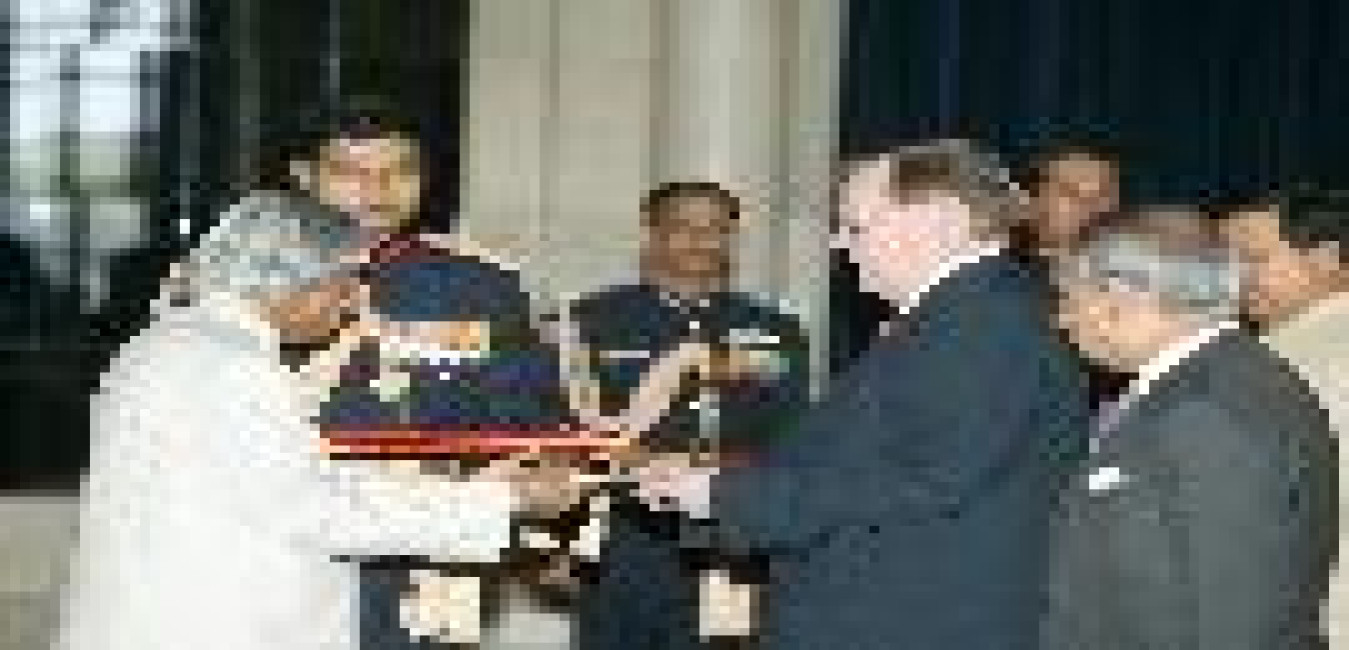 The Ambassador-Designate of Kingdom of Nepal to India, HE Mr Karna Dhoj Adhikary presenting his credentials to the President of India, Dr A P J Abdul Kalam at the Ashok Hall of Rashtrapati Bhavan in New Delhi on Feb 20, 2004