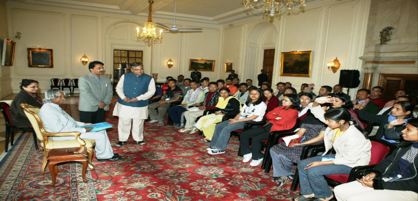 The Students from North-Eastern States participating in the India Tour Experience organised by the Akhil Bharatiya Vidyarthi Parishad calling on the President of India, Dr A P J Abdul Kalam at the Yellow Drawing Room of Rashtrapati Bhavan in New Delhi on Jan 15, 2004