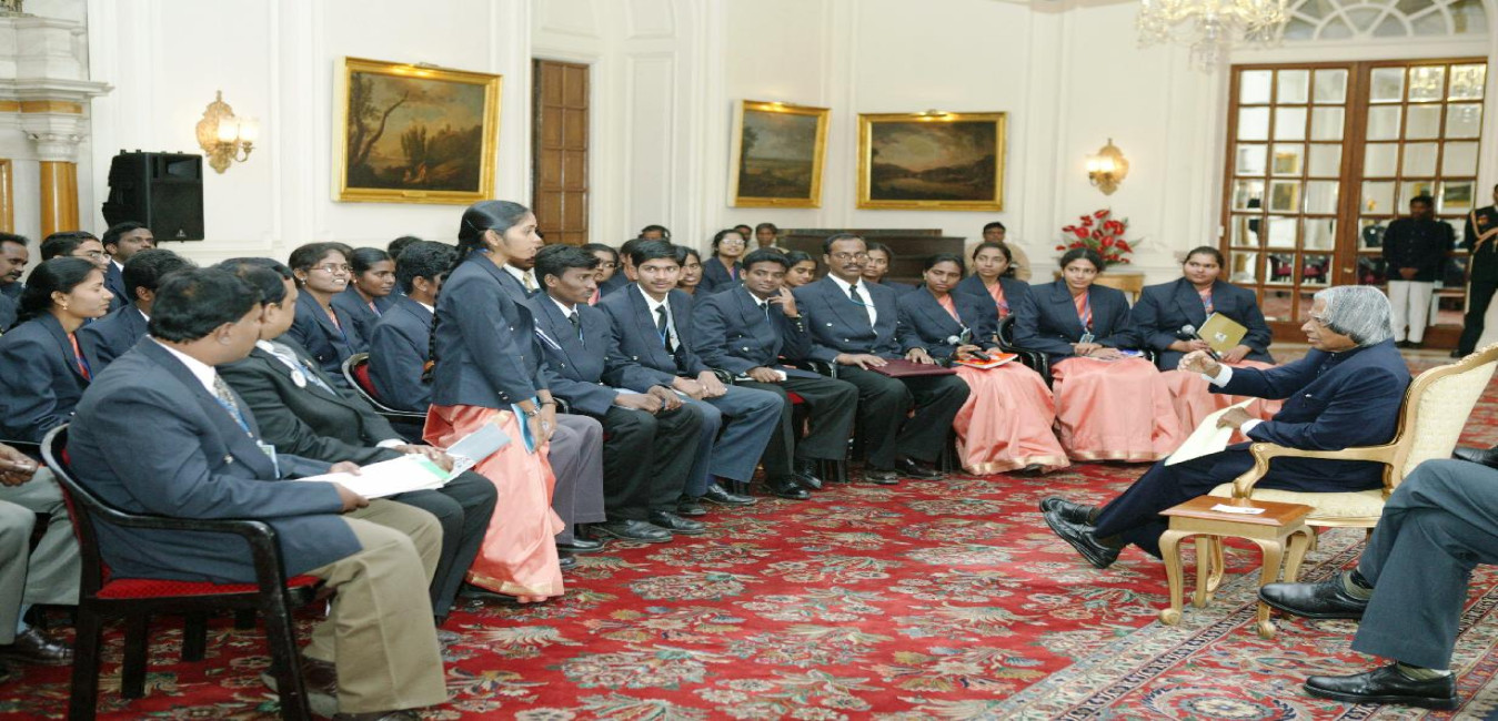 The Student Participants of OP SAMPARK Student Excursion to North East organized by the Directorate General Assam Rifles calling on the President of India, Dr A P J Abdul Kalam at the Yellow Drawing Room of Rashtrapati Bhavan in New Delhi on Dec 31, 2003