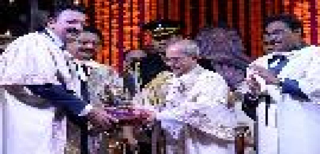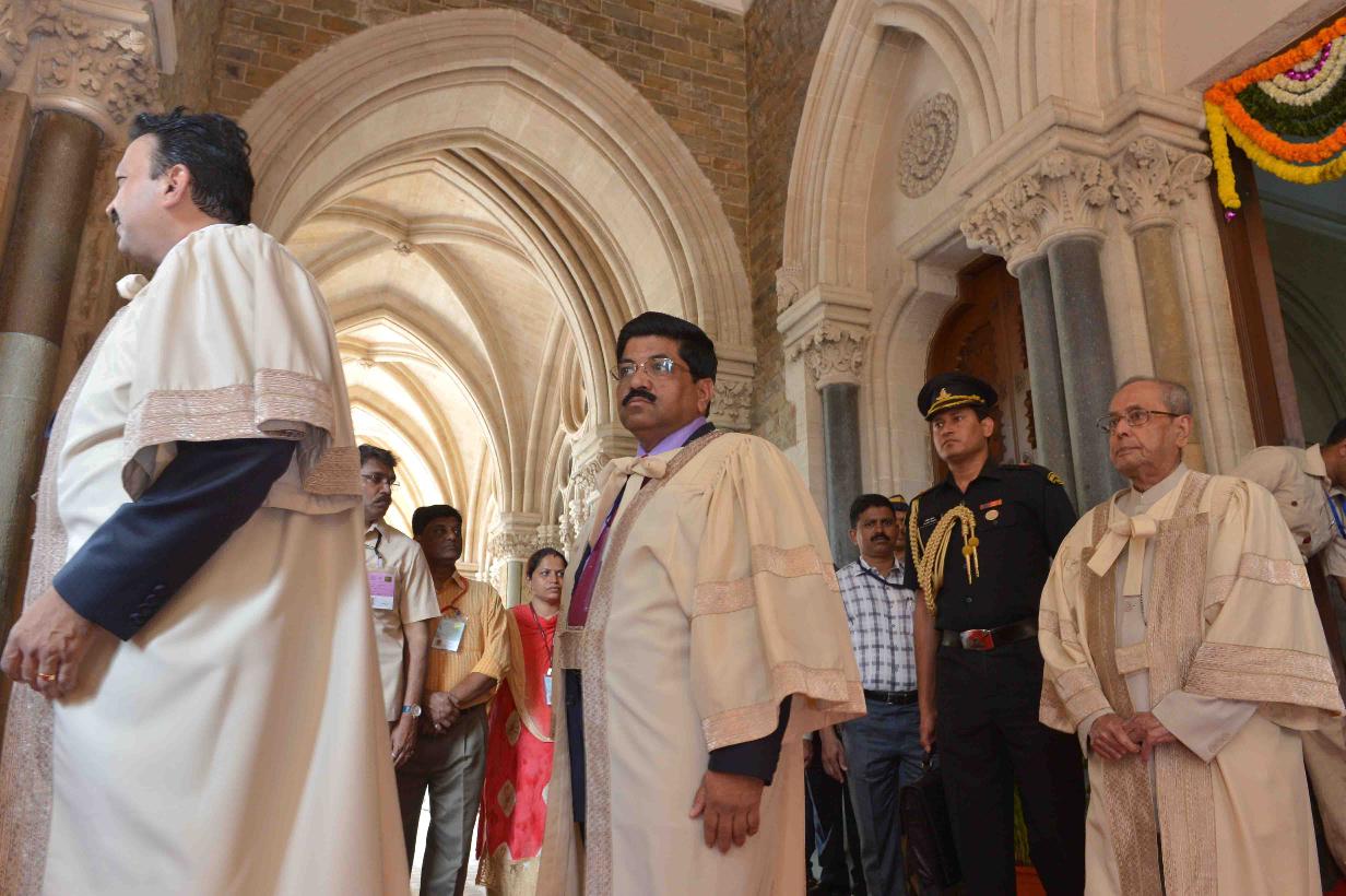 The President of India, Shri Pranab Mukherjee being felicitated by the Vice Chancellor, University of Mumbai, Dr. Sanjay Deshmukh, at the Special Convocation of University of Mumbai, at Mumbai, in Maharashtra on March 17, 2017.