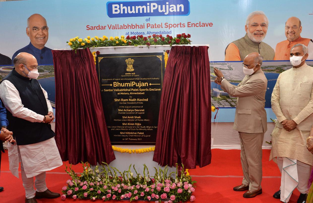 The President of India, Shri Ram Nath Kovind inaugurating Narendra Modi Cricket Stadium and laying foundation stone of Sardar Vallabhbhai Patel Sports Enclave, in Ahmedabad on February 24, 2021.
