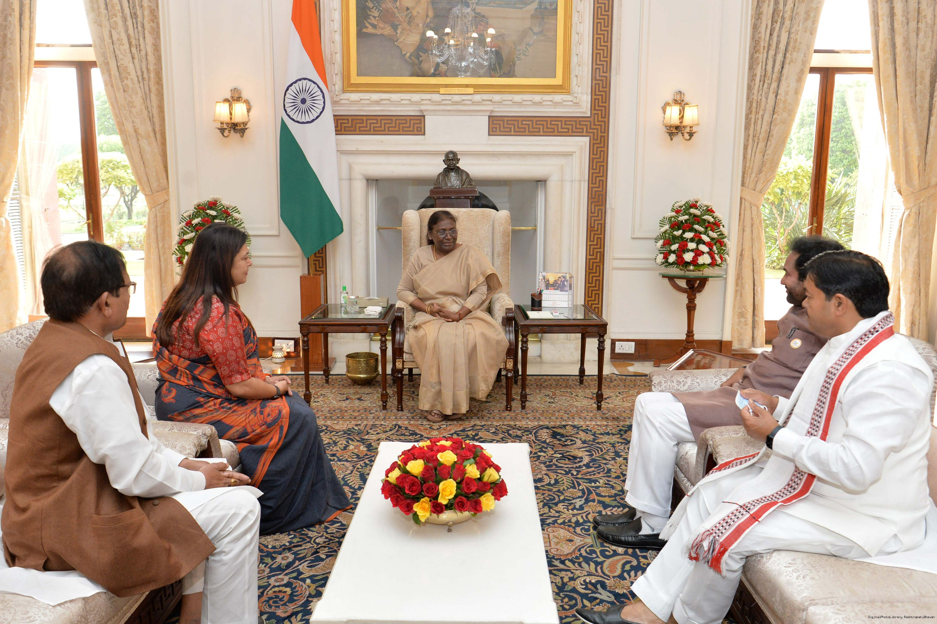 The Union Minister for Culture, Tourism DoNER, Shri G. Kishan Reddy along with the Minister of State for External Affairs Culture, Smt. Meenakashi Lekhi, the Minister of State for DoNER Cooperation, Shri B.L. Verma and the Minister of State for Ports, Shipping Waterways Tourism, Shri Shripad Yesso Naik calling on the President of India, Smt. Droupadi Murmu, at Rashtrapati Bhavan on August 24, 2022.