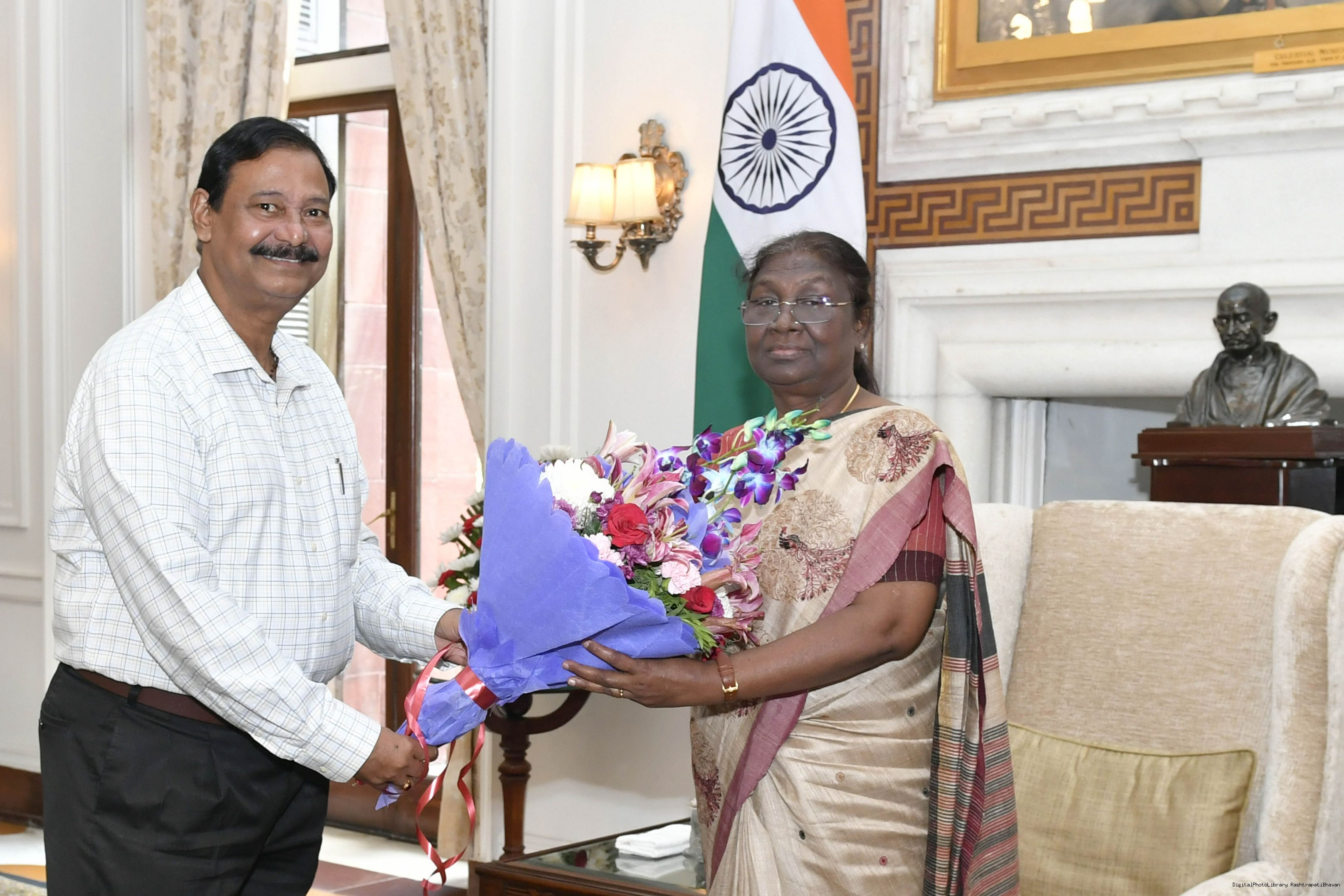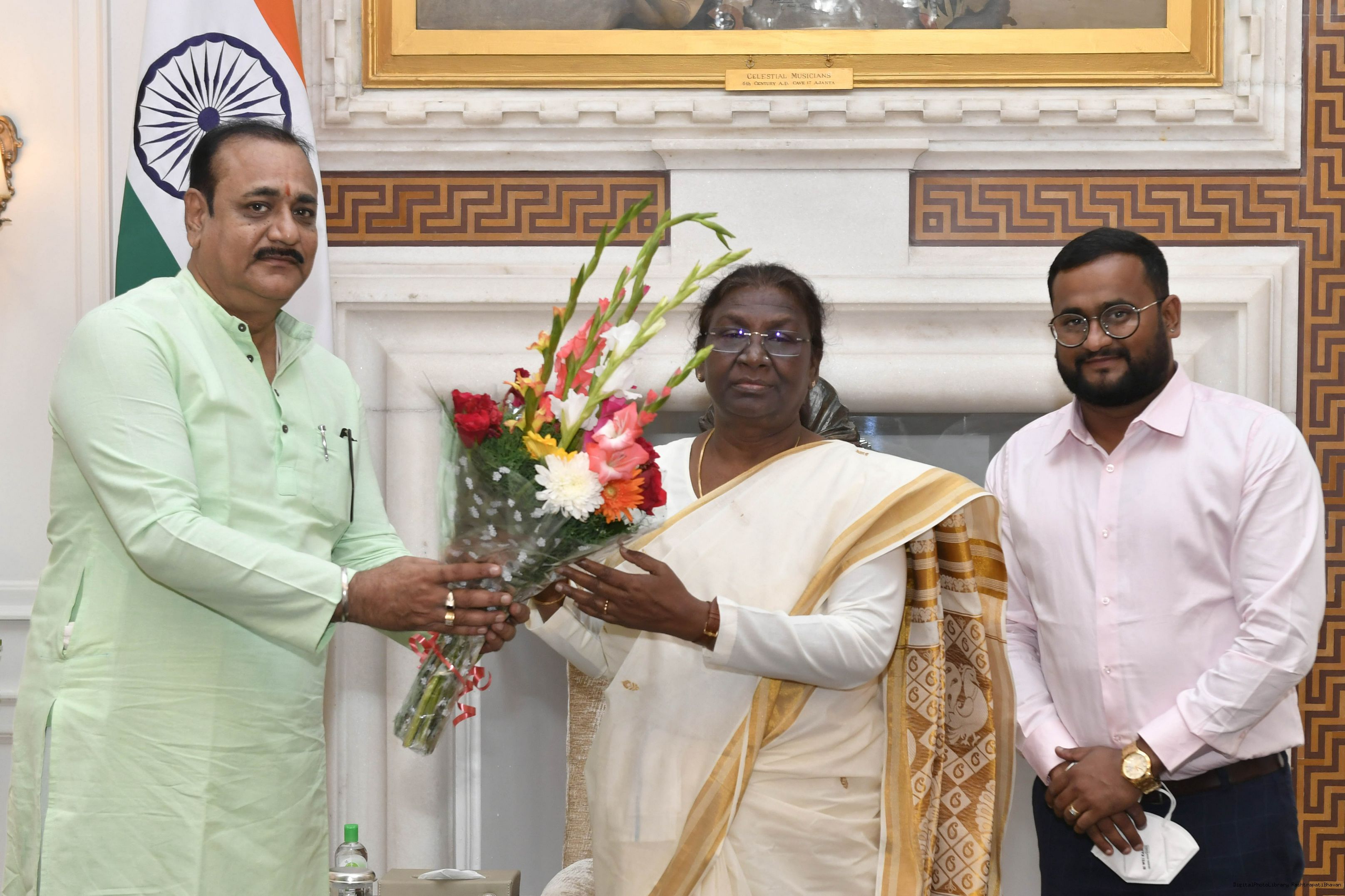Shri Pawan Sharma along with his son Shri Saurav Sharma from Rairangpur meeting with the President of India, Smt. Droupadi Murmu, at Rashtrapati Bhavan on Aug 24, 2022.