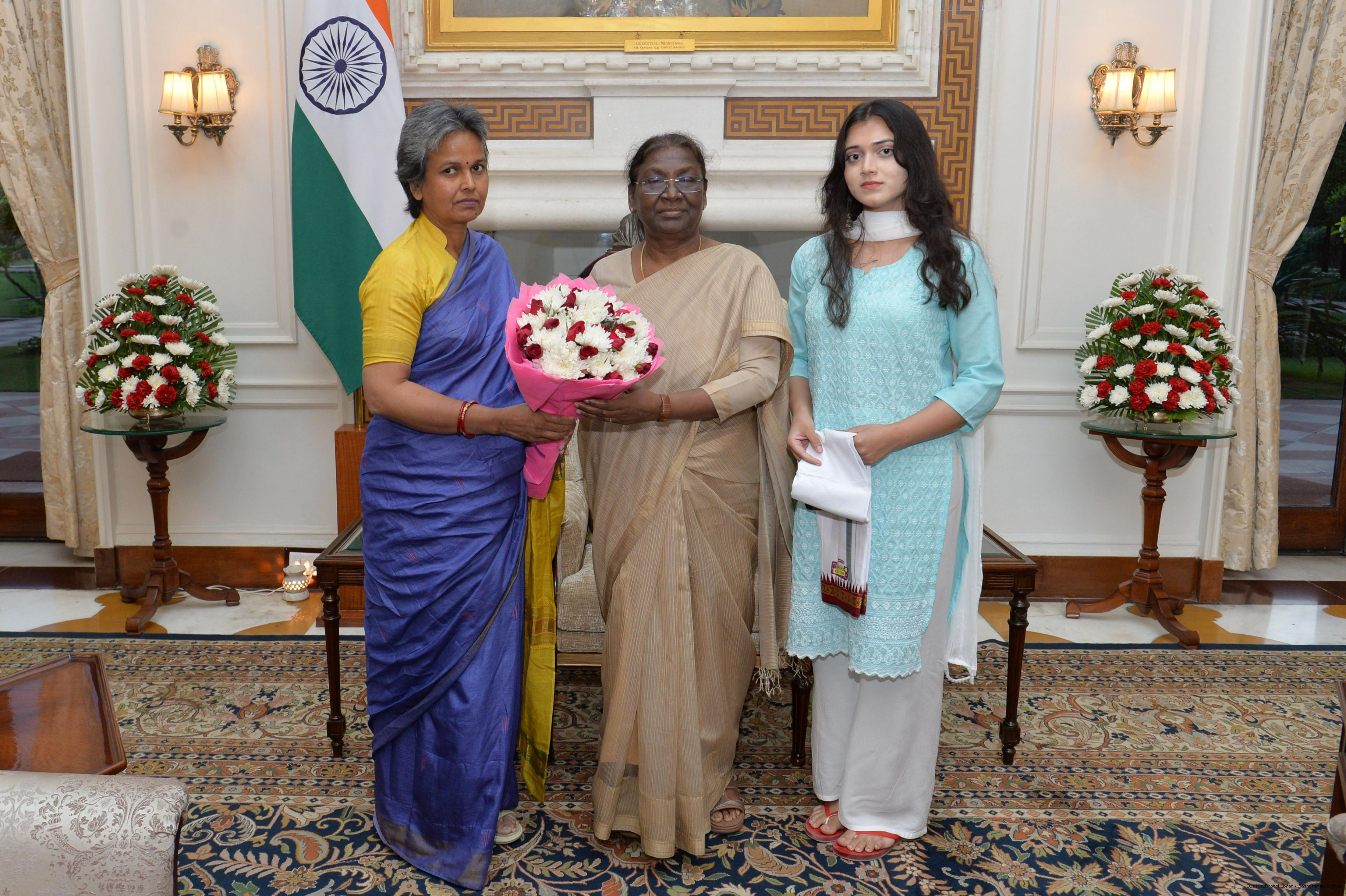 Smt. Sapna Jha along with her daughter meeting with the President of India, Smt. Droupadi Murmu, at Rashtrapati Bhavan on Aug 24, 2022.