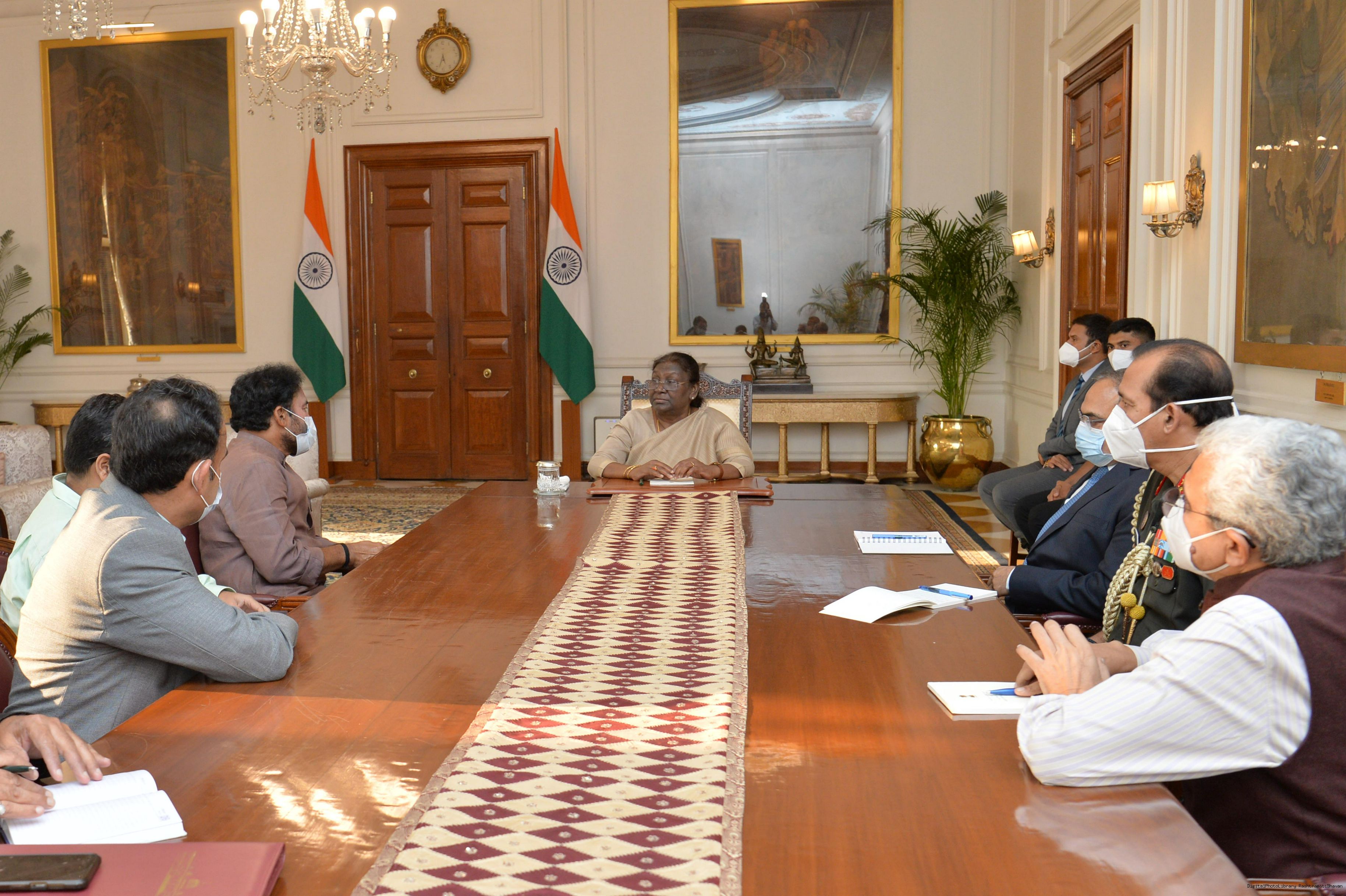 Shri G. Kishan Reddy, Minister of Culture, Tourism DoNER along with Shri EV Bhaskar, Shri Kanaka Shri RS Dangi meeting with the President of India, Smt. Droupadi Murmu, at Rashtrapati Bhavan on Aug 24, 2022.