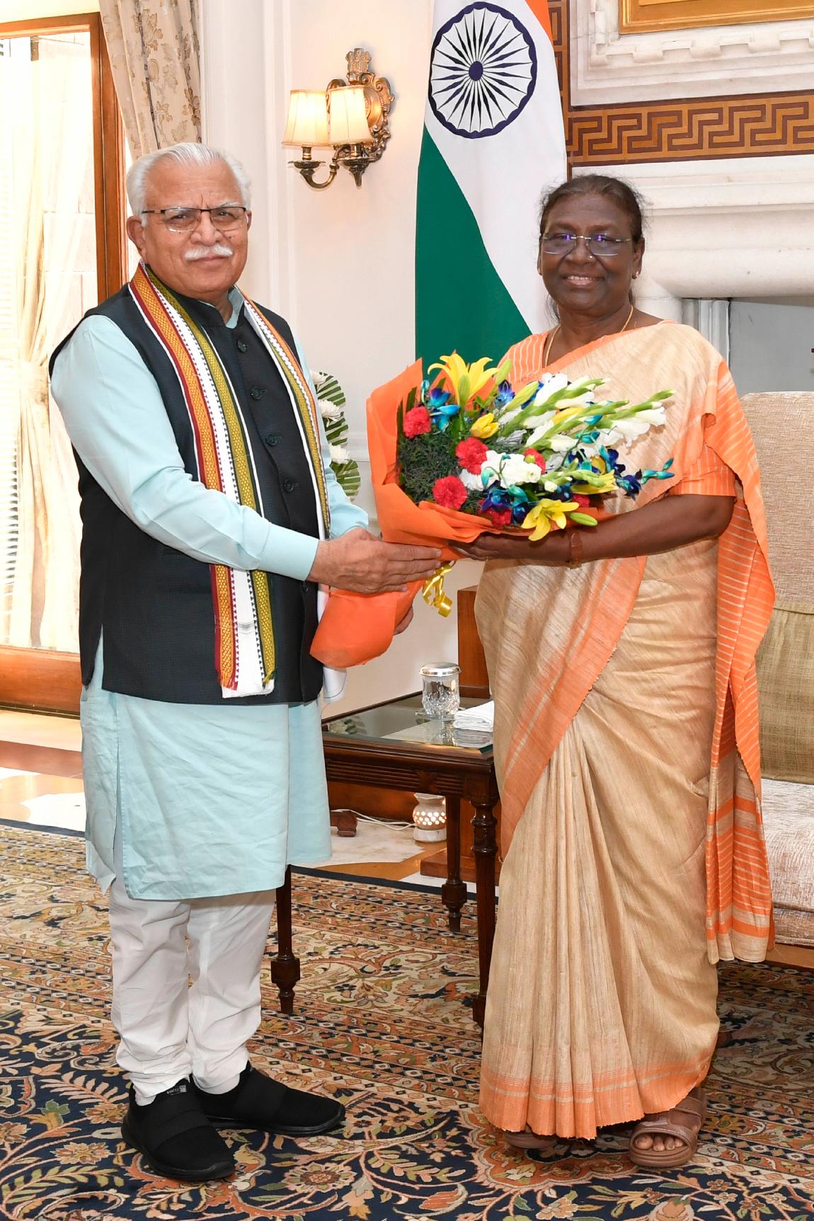 The Chief Minister of Haryana, Shri Manohar Lal calling on the President of India, Smt. Droupadi Murmu, at Rashtrapati Bhavan on August 23, 2022.