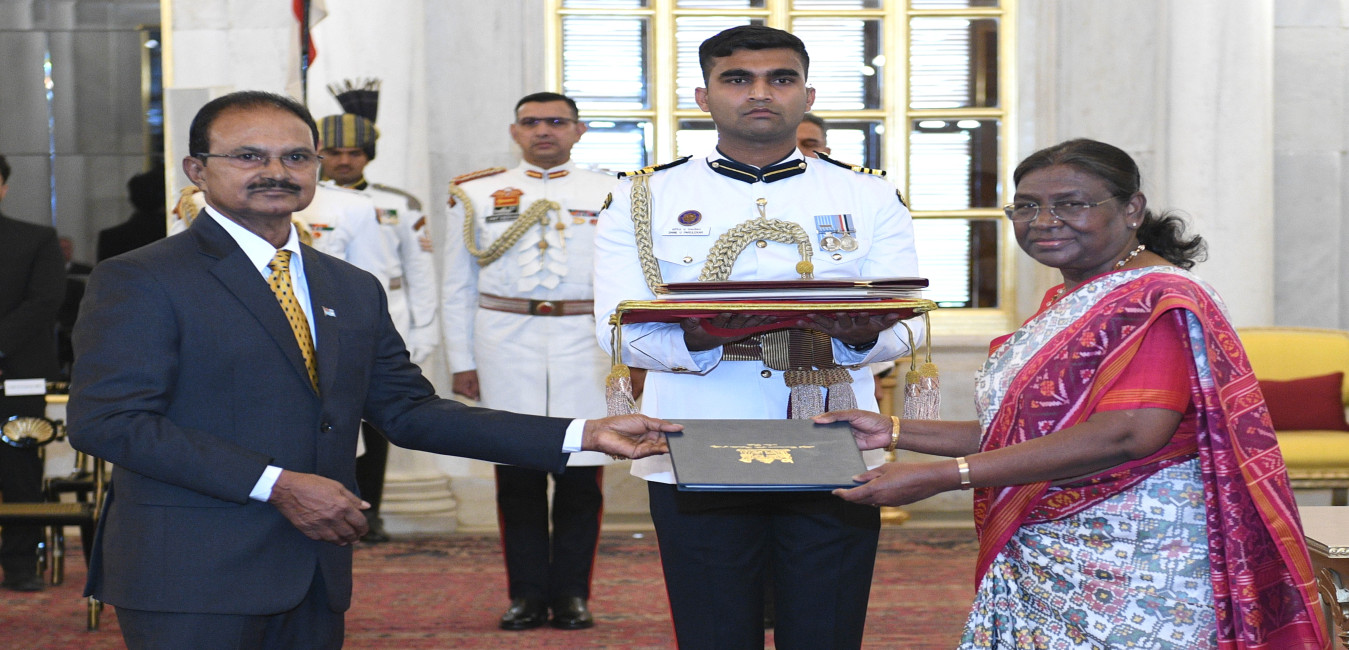 The High Commissioner-designate of the Republic of Fiji, H.E. Mr Jagnnath Sami presenting his credentials to the President of India, Smt Droupadi Murmu at a ceremony held at Rashtrapati Bhavan on May 31, 2024.
