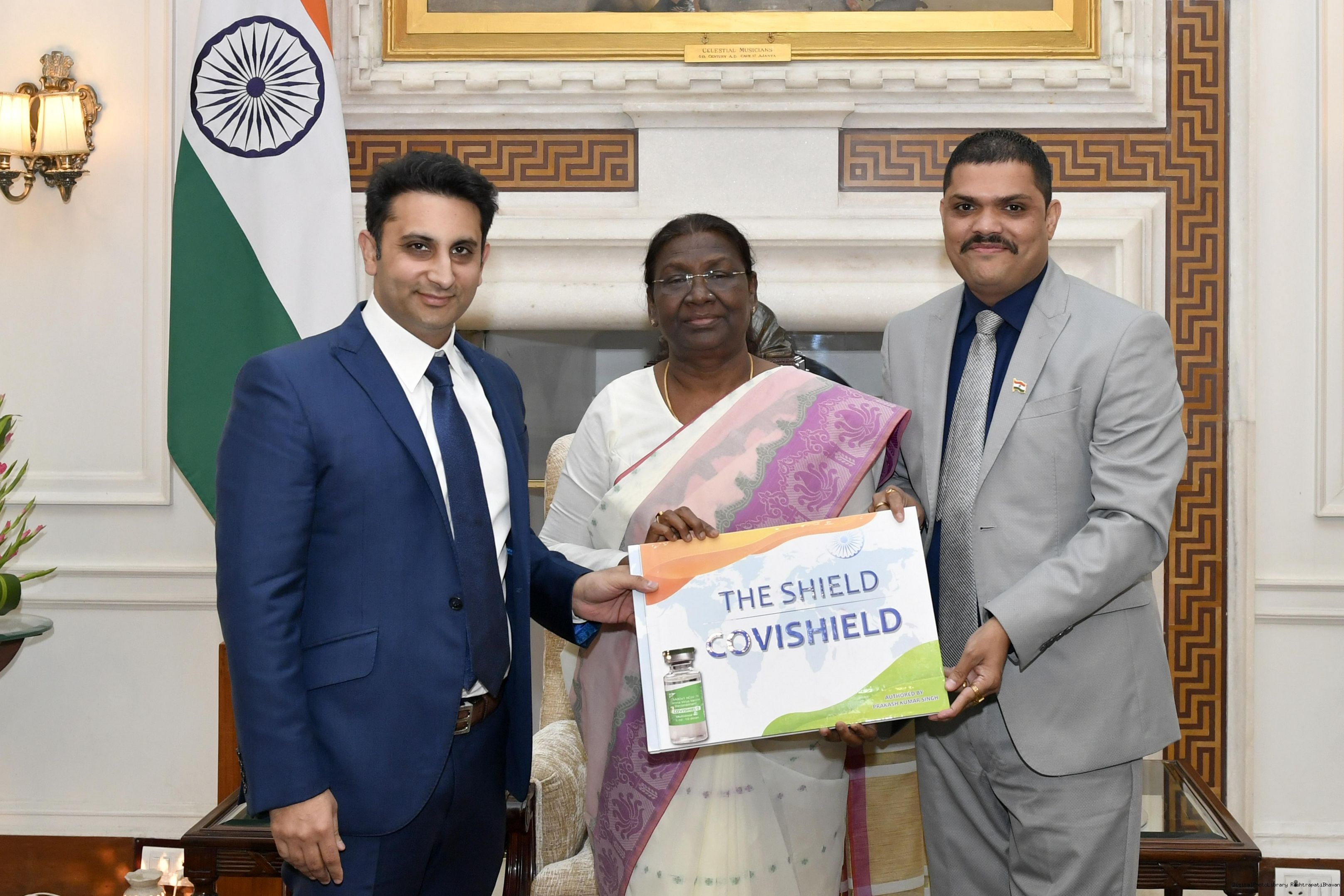 Shri Adar C. Poonawala, CEO and Shri Prakash Kumar Singh, Director, Serum Institute of India Pvt. Ltd. meeting with the President of India, Smt. Droupadi Murmu, at Rashtrapati Bhavan on Aug 01, 2022.