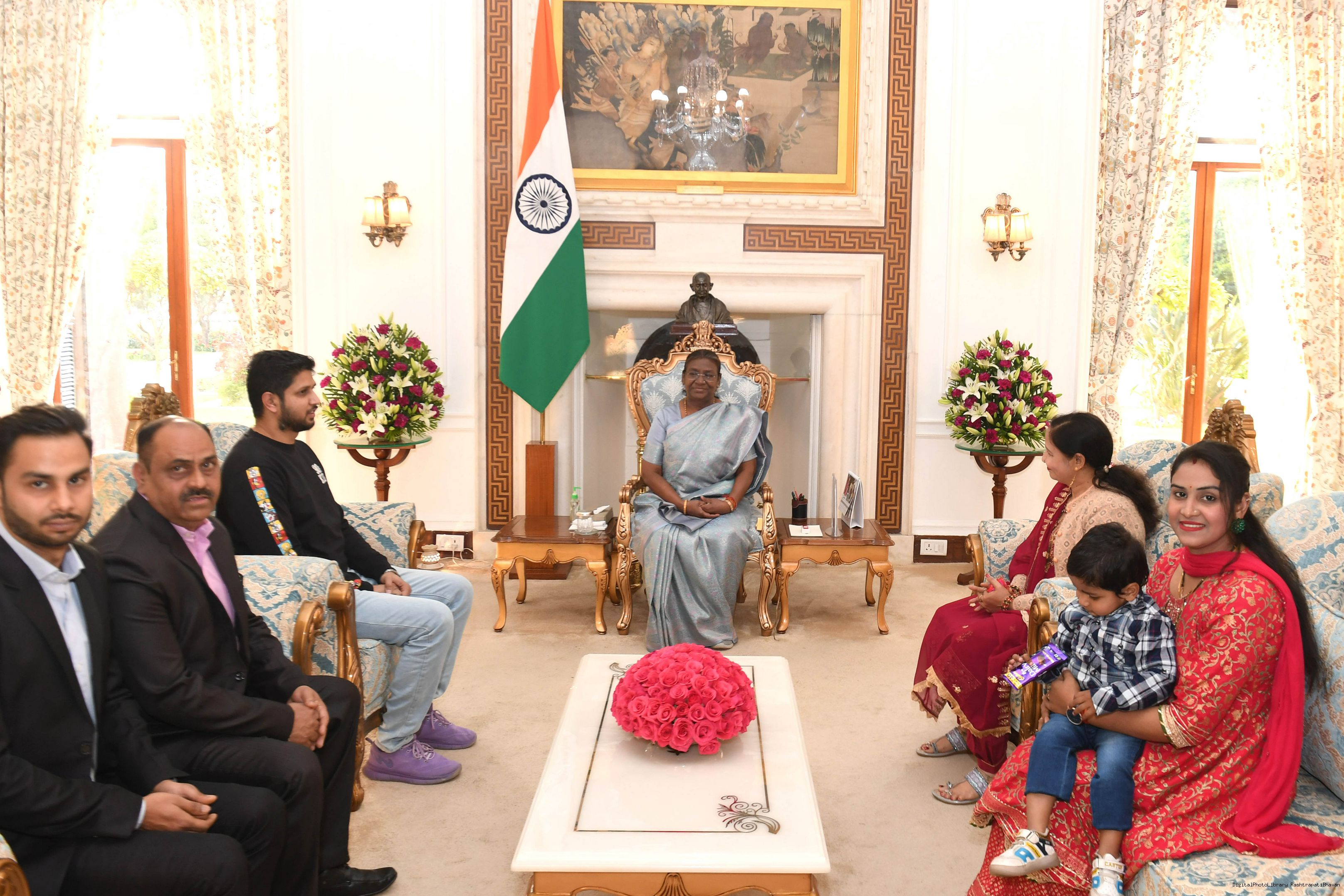 Shri Balbir Singh, Senior Household Attendant (Retd) along with his family members meeting with the President of India Smt Droupadi Murmu at Rashtrapati Bhavan on February 27, 2024.