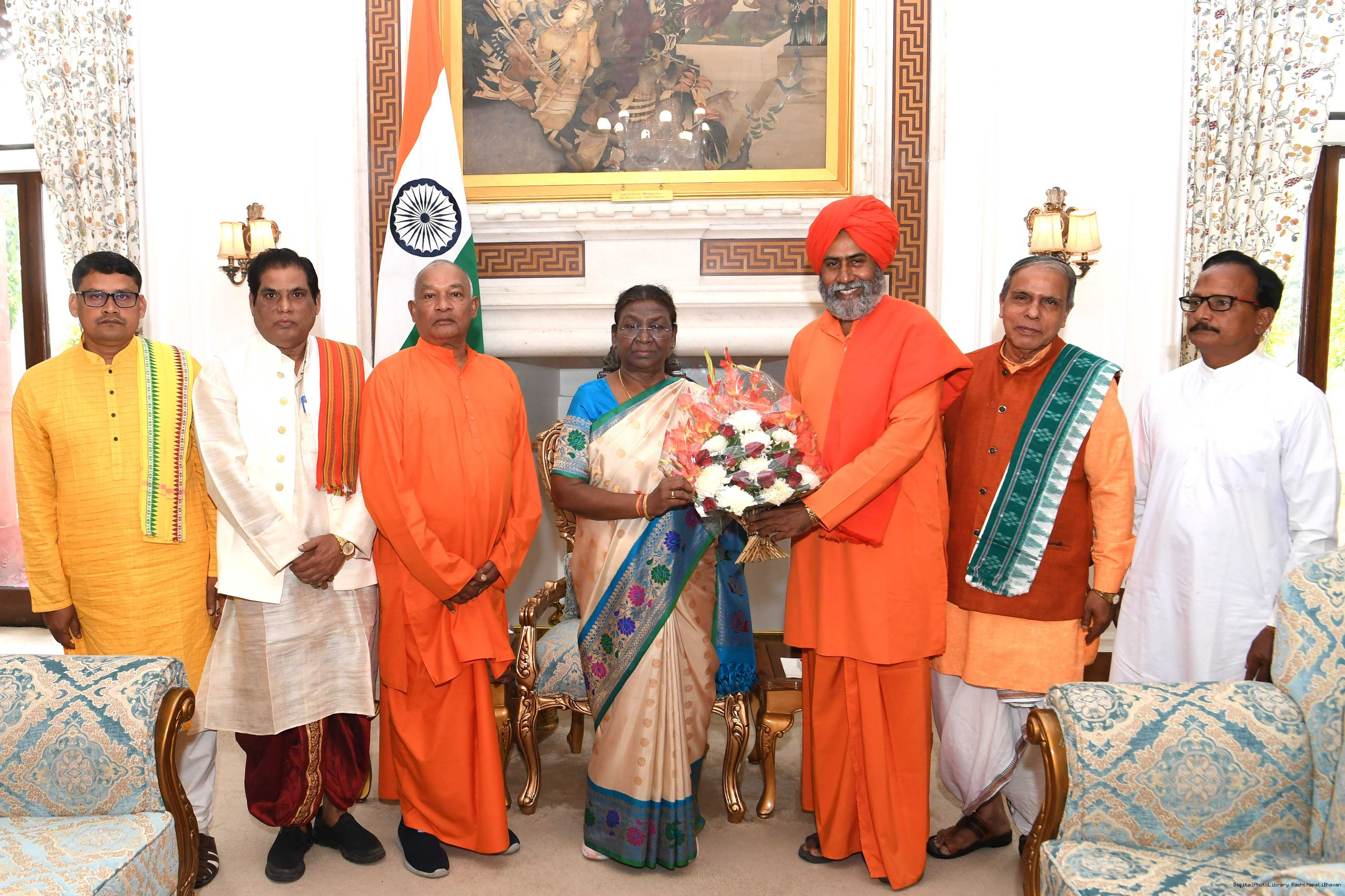 Shri Basant kumar Panda MP Lok Sabha from kalahandi along with Swami Vratanand Saraswati Swami Sudhanand Saraswati meeting with the President of India Smt. Droupadi Murmu at Rashtrapati Bhavan on November 15, 2023
