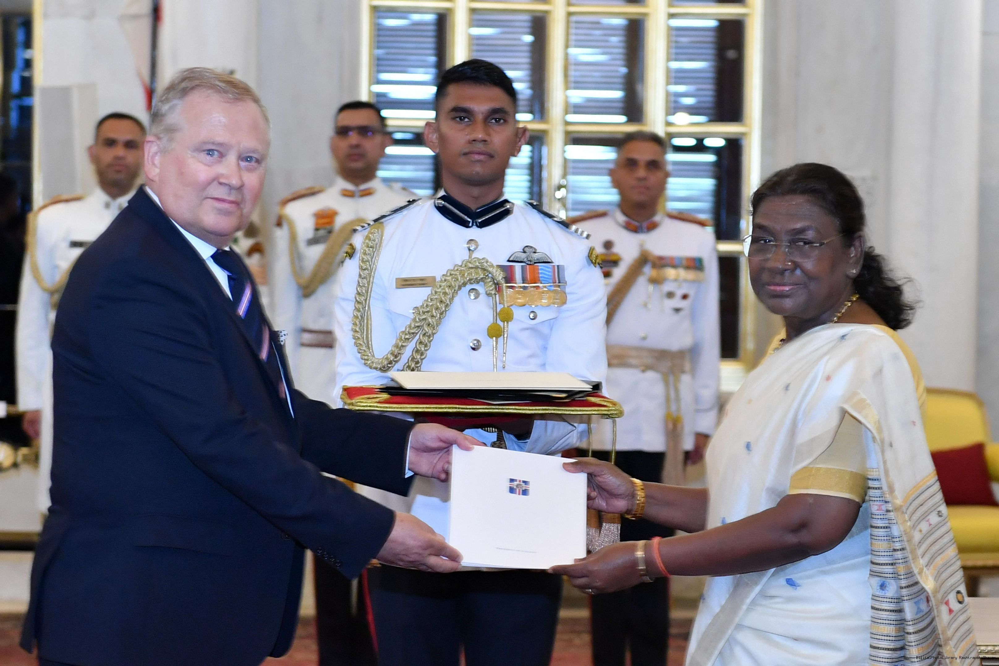 The Ambassador-designate of Iceland, H.E. Mr Benedikt Hoskuldsson presenting his credentials to the President of India, Smt Droupadi Murmu at Rashtrapati Bhavan on September 6, 2024.