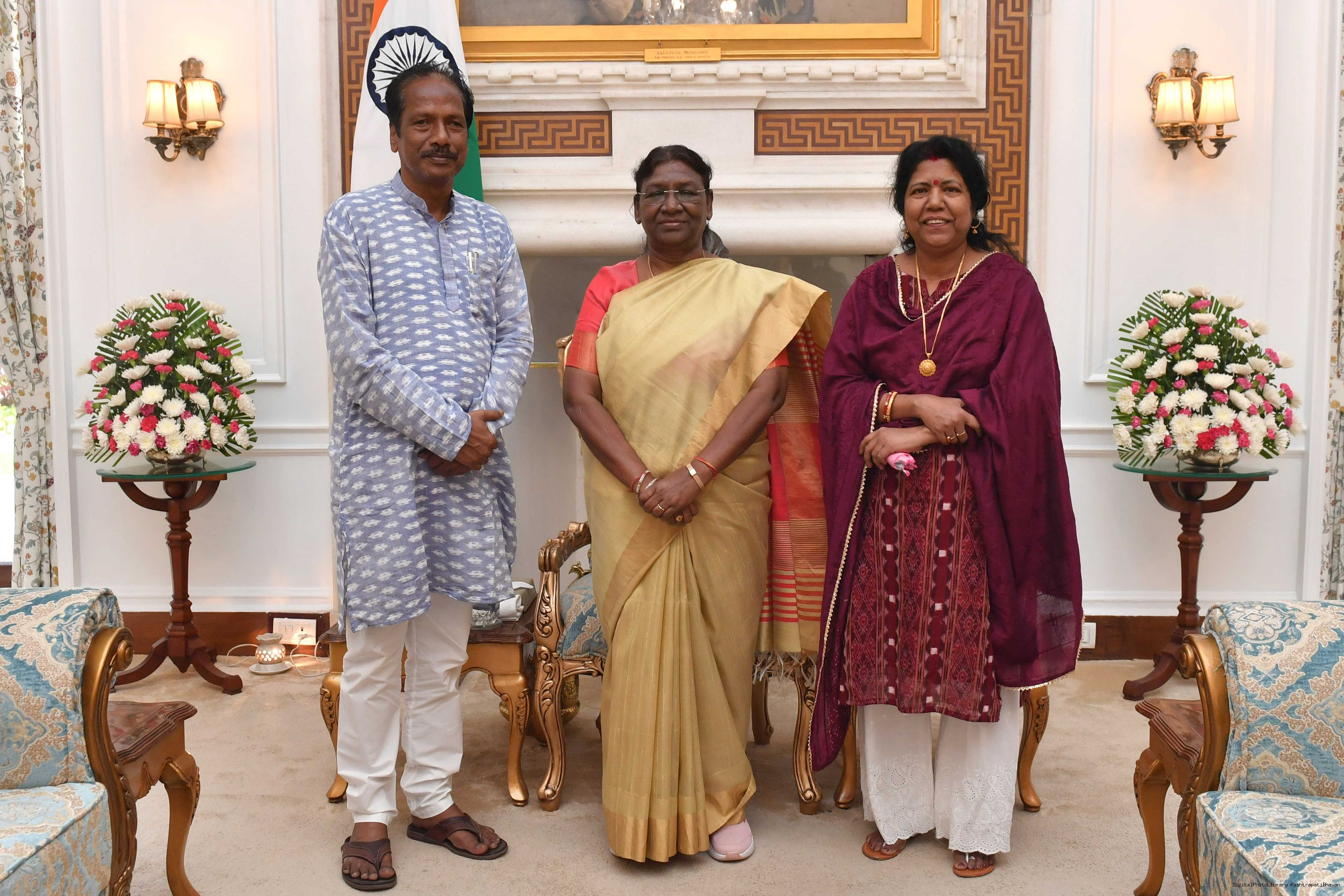 Shri Mahesh Sahoo, MP, Lok Sabha, Dhenkanal, Odisha along with others meeting with the President of India, Smt. Droupadi Murmu at Rashtrapati Bhavan on September 22, 2023.