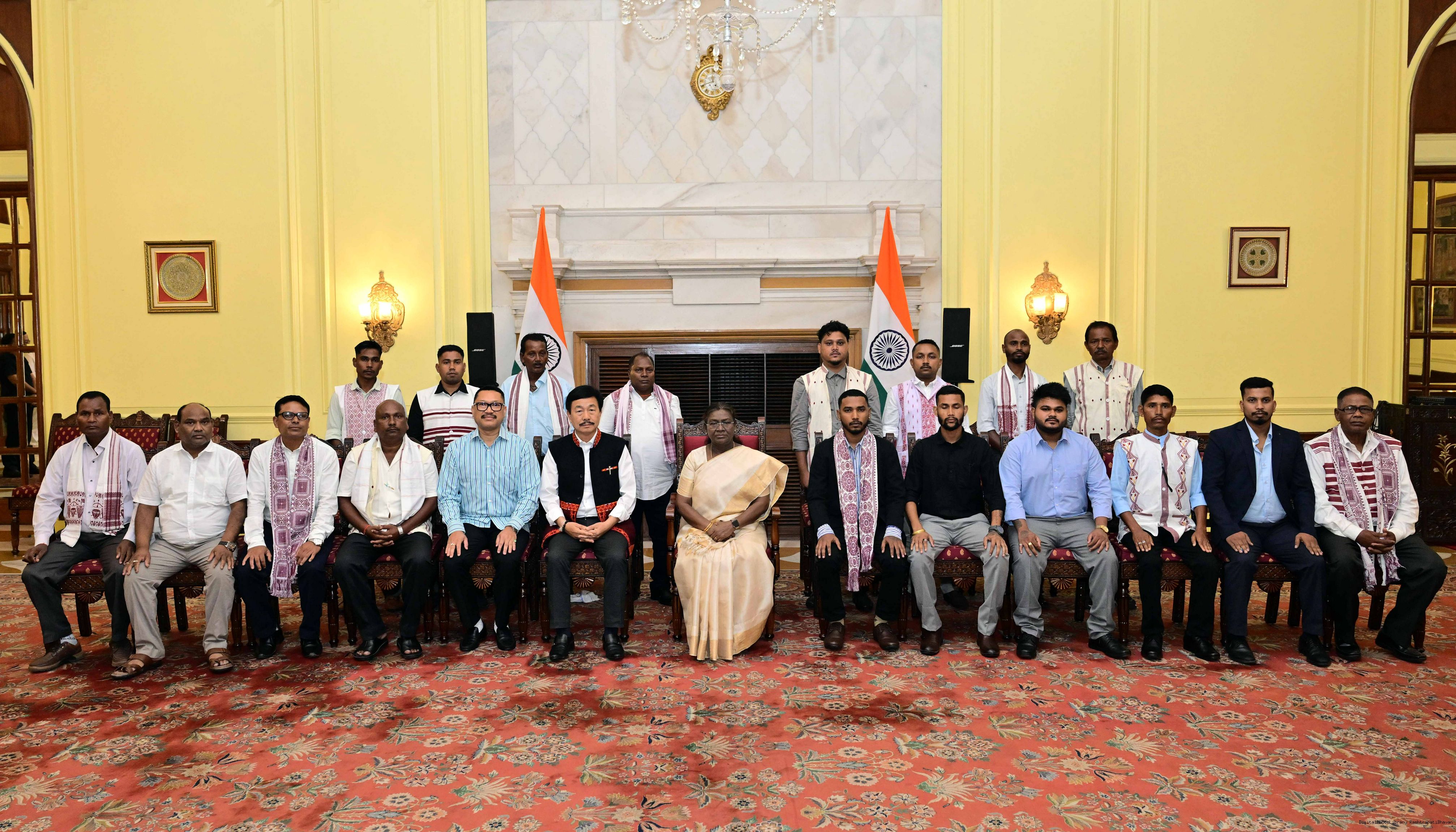 The President of India, Smt. Droupadi Murmu posing a group photographs with 21 persons consisting of Shri Tapir Gao, MP (Lok Sabha) from Arunachal Pradesh along with 20 others at Rashtrapati Bhavan on June 25, 2025.