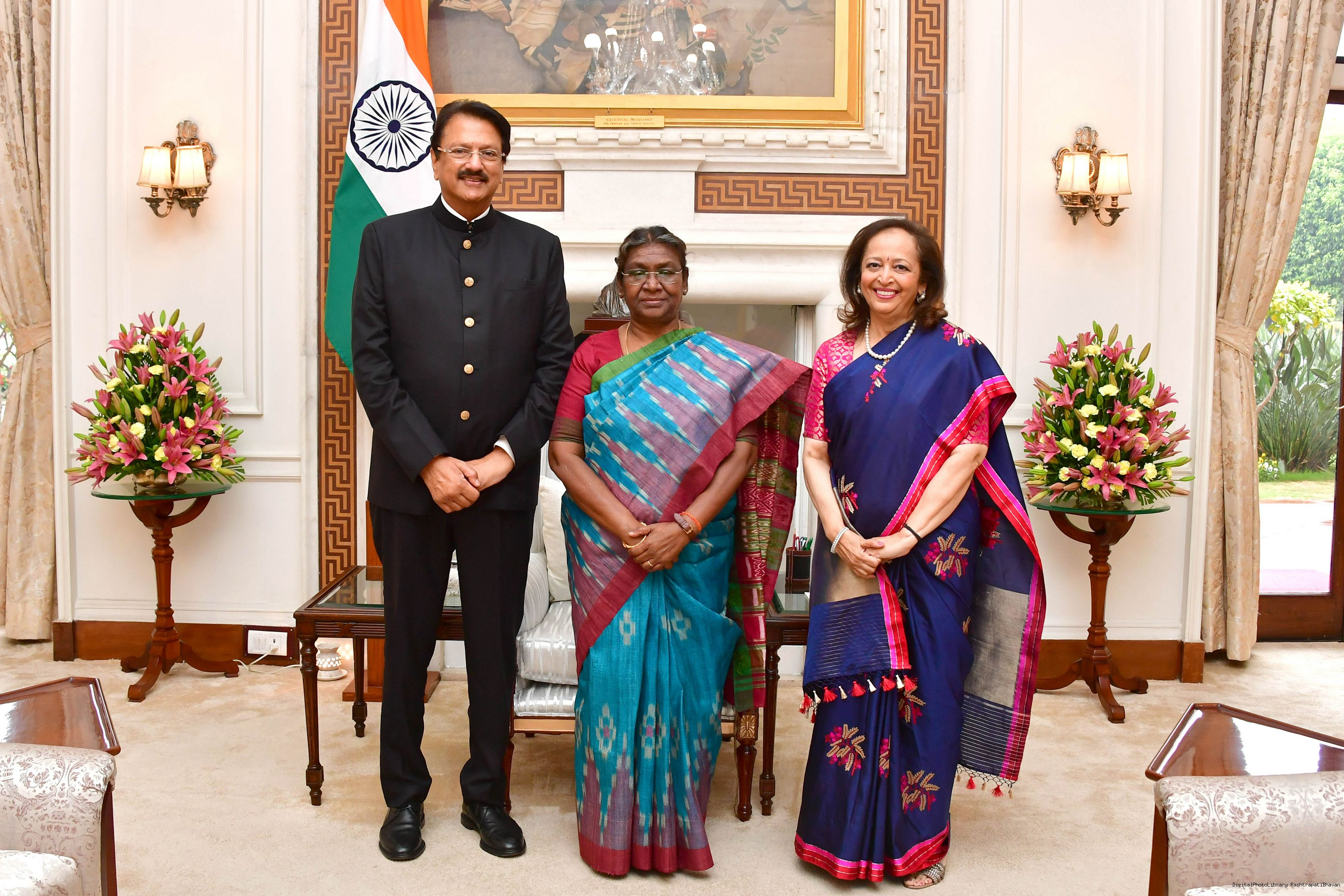 Shri Ajay Piramal, Chairman, Piramal Group and Chair- Board, Piramal Foundation along with Dr. Swati Piramal, Vice Chairman, Piramal Group and Chair-Board, Piramal Swasthya meeting with the President of India, Smt. Droupadi Murmu at Rashtrapati Bhavan on March 24, 2023