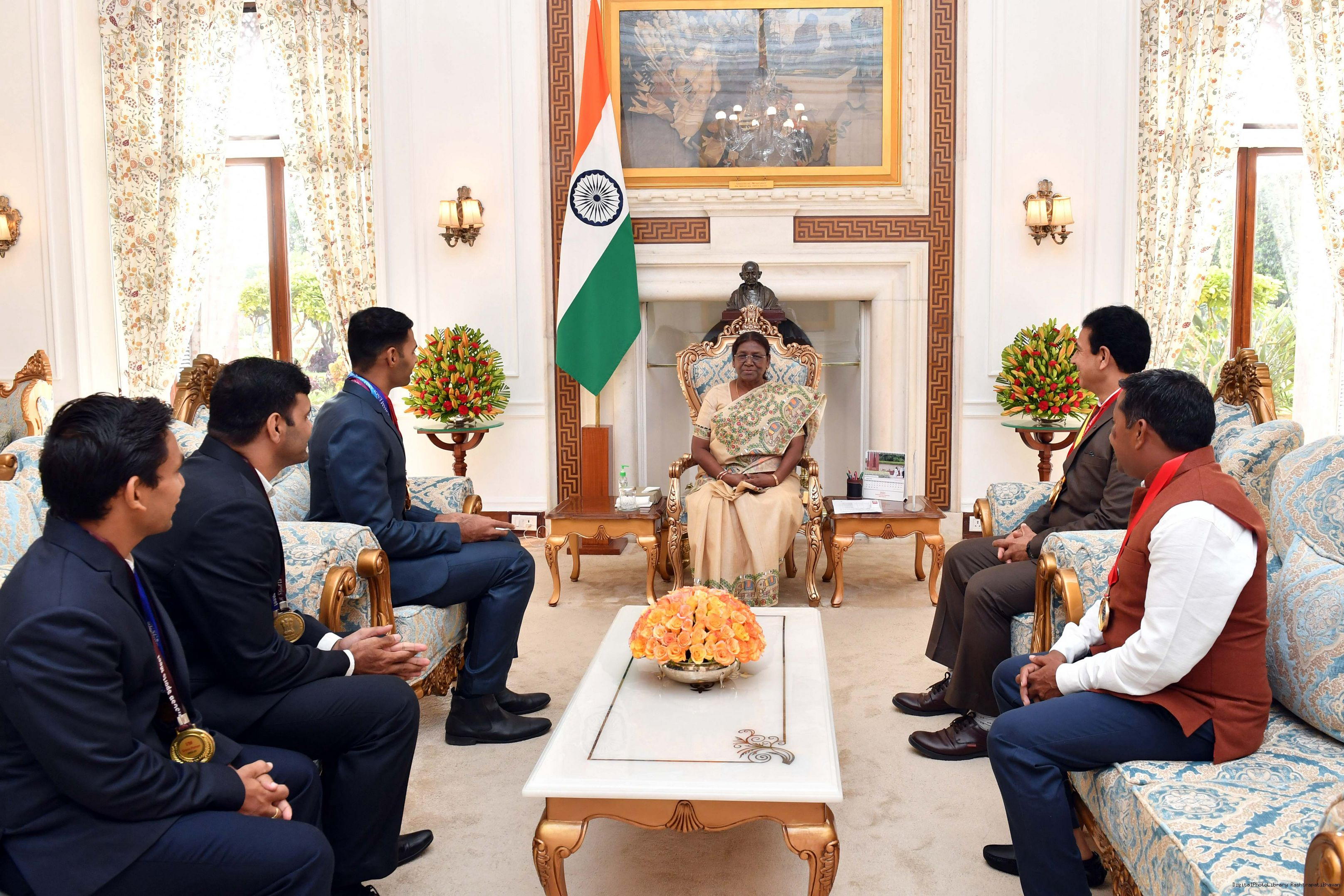 Shri Akshay Mahara Booshanam along with others meeting with the President of India Smt. Droupadi Murmu at Rashtrapati Bhavan on August 30, 2024.