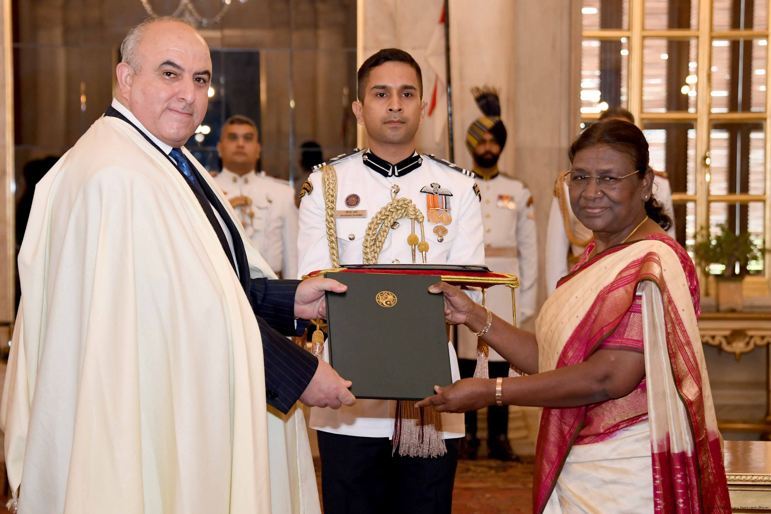 The Ambassador-designate of thr People's Democratic Republic of Algeria, H.E. Mr. Ali Achoui presenting his credentials to the President of India, Smt Droupadi Murmu at Rashtrapati Bhavan in New Delhi on August 21, 2023.