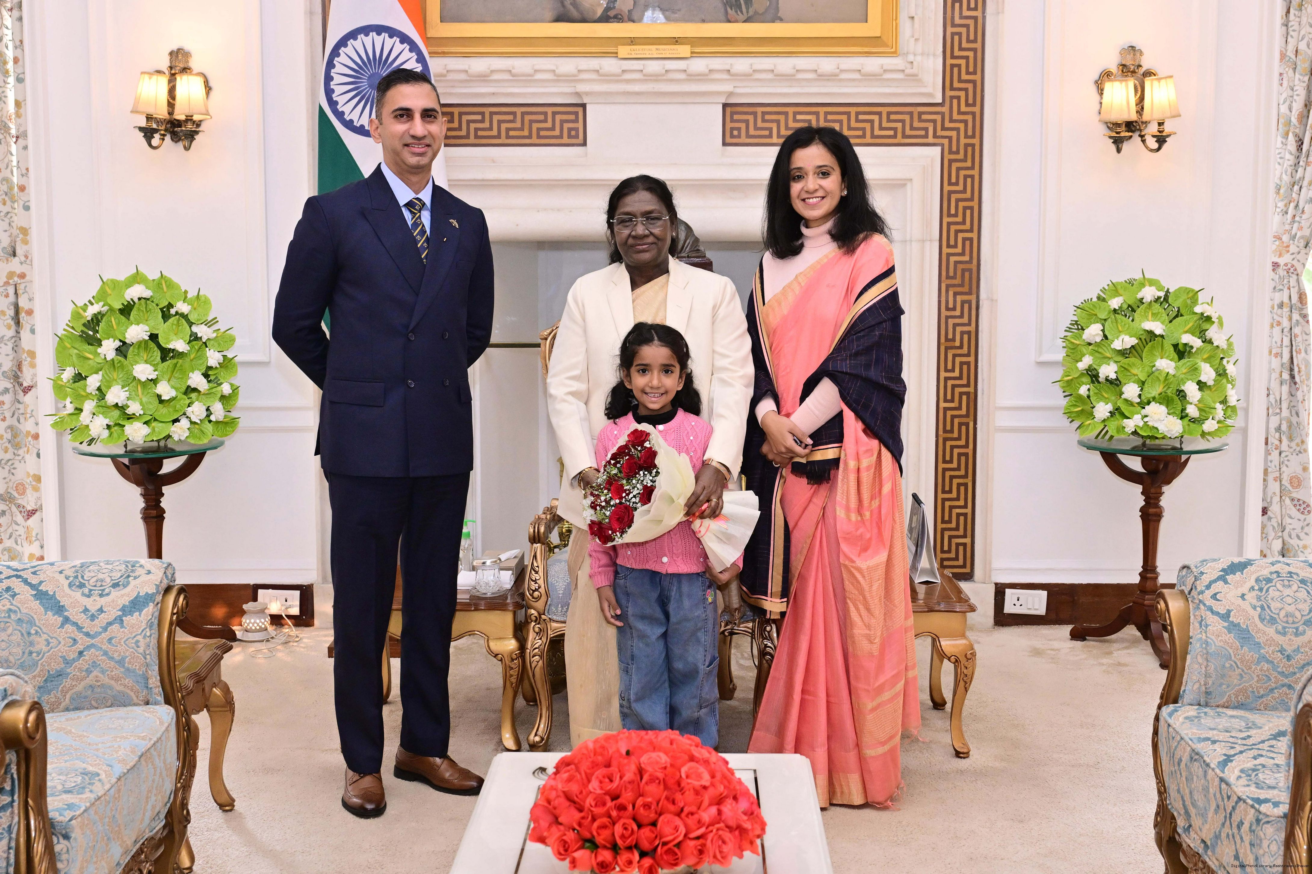 Gp Capt Amit Gehani, Commanding Officer of 17 Sqn (Rafale) along with family meeting with the President of India, Smt Droupadi Murmu at Rashtrapati Bhavan on January 7, 2026.