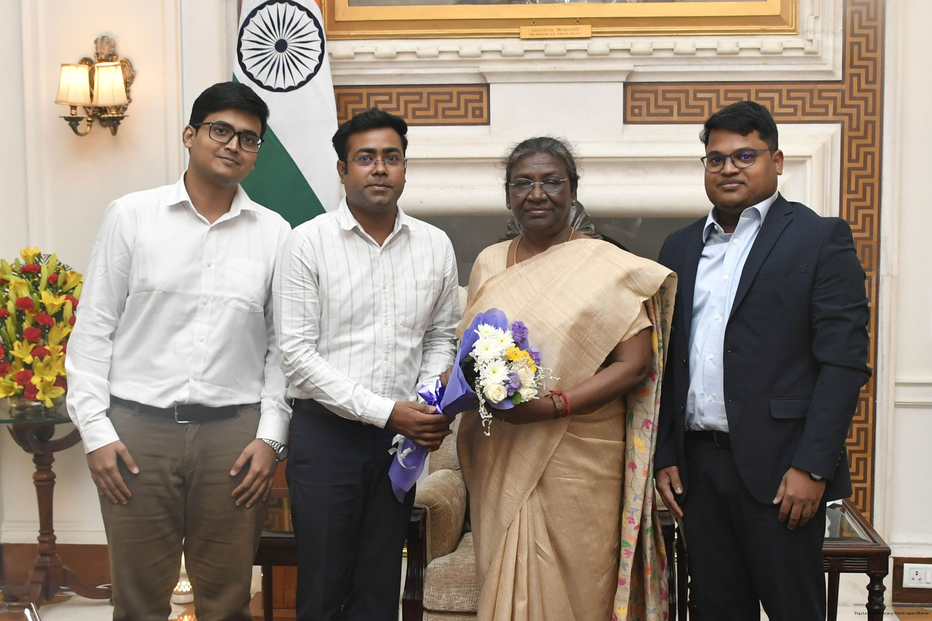 Shri Amlan Mohanta, Shri Umakanta Sahu and Shri Sunny Sandip Agrawal from Rairangpur meeting with the President of India, Smt. Droupadi Murmu, at Rashtrapati Bhavan on Nov 08, 2022.