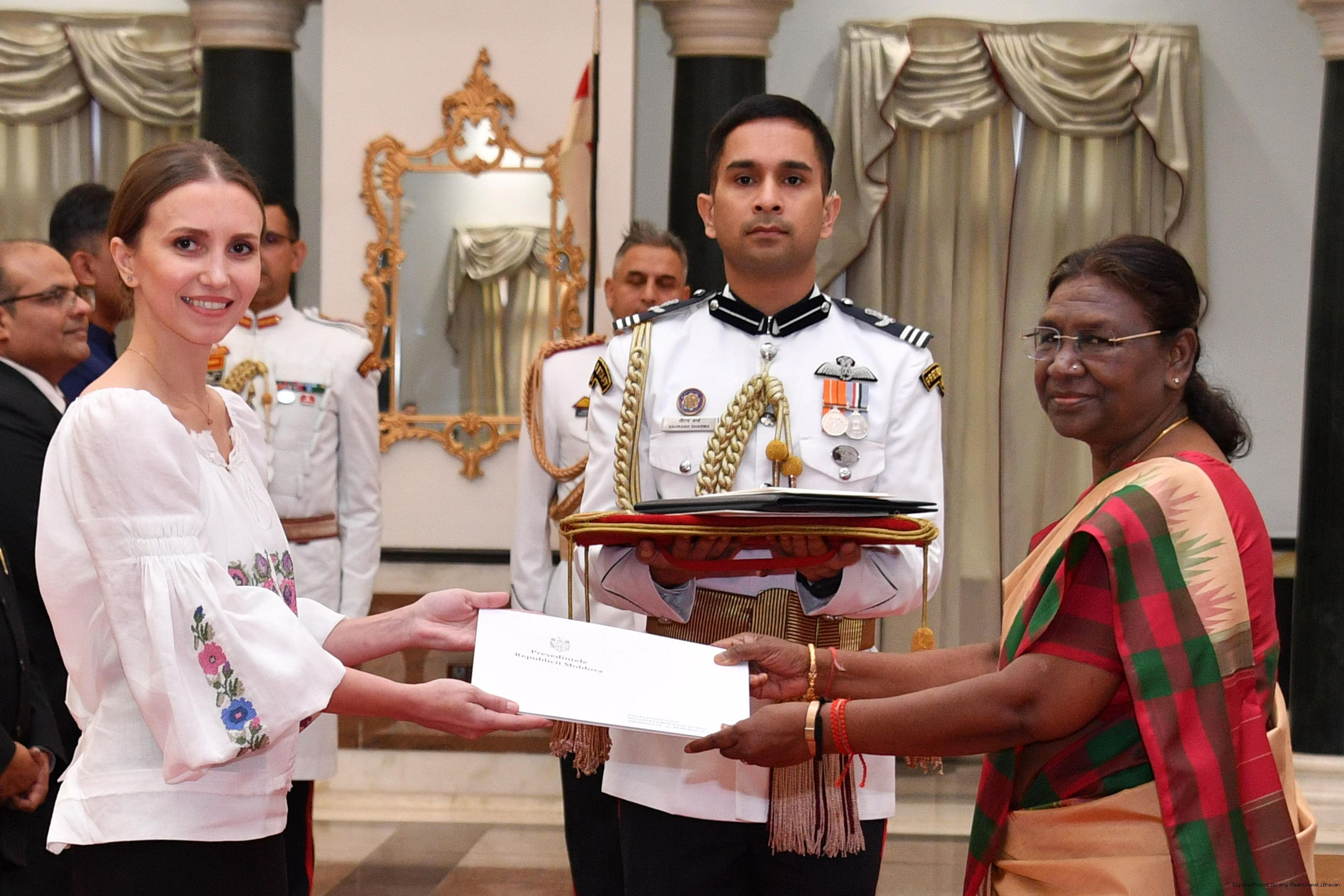 The Ambassador-Designate of the Republic of Moldova, H.E. Mrs Ana Taban presenting her credentials to the President of India, Smt Droupadi Murmu at Rashtrapati Bhavan on October 23, 2023.