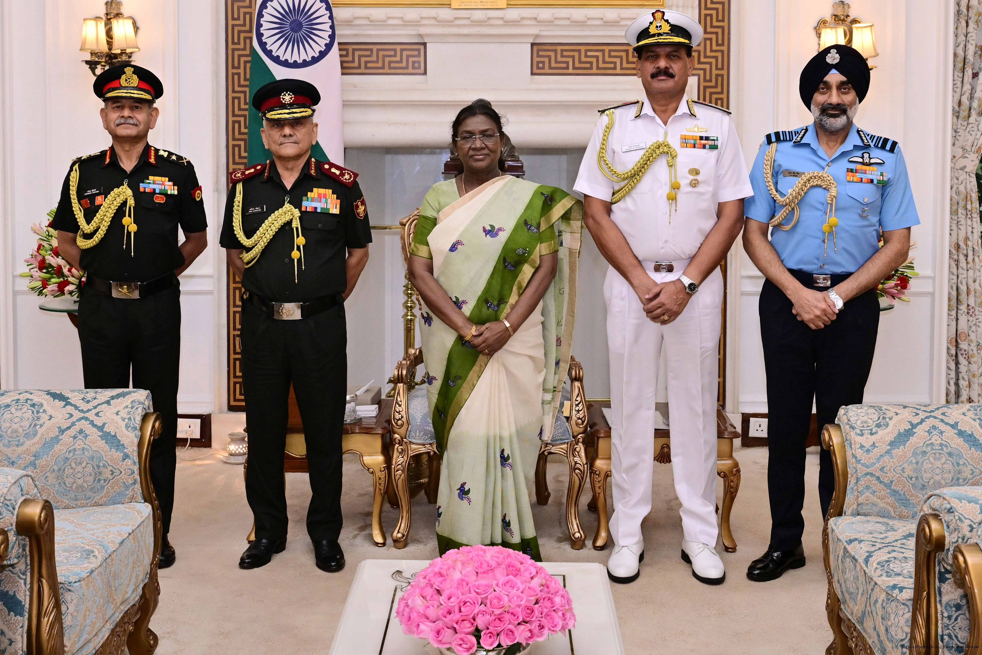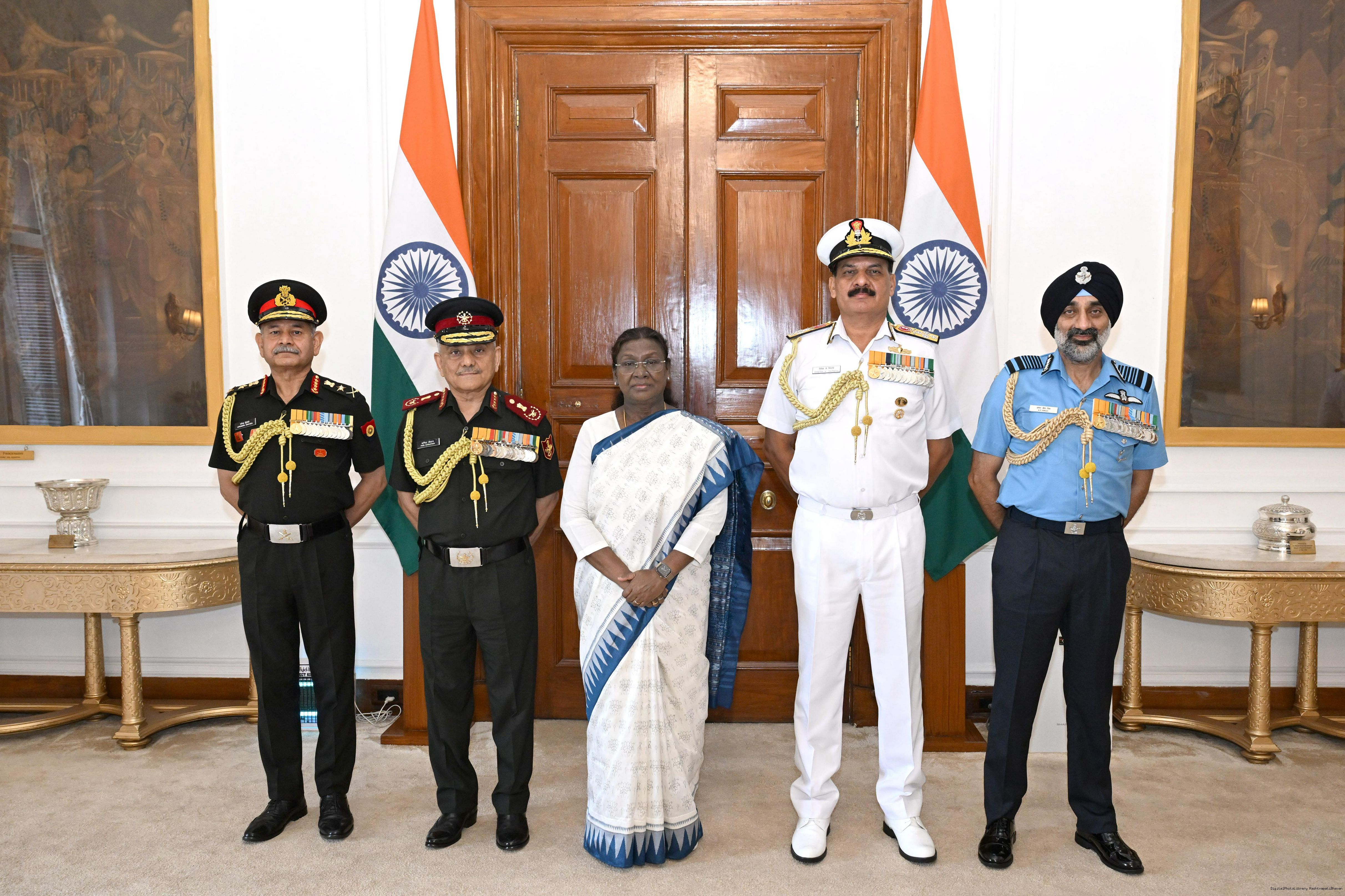 General Anil Chauhan, Chief of Defence Staff, along with General Upendra Dwivedi, Chief of the Army Staff, Air Chief Marshal A. P. Singh, Chief of the Air Staff, and Admiral Dinesh K. Tripathi, Chief of the Naval Staff, called on the President of India, Smt. Droupadi Murmu at Rashtrapati Bhavan on September 30, 2025.