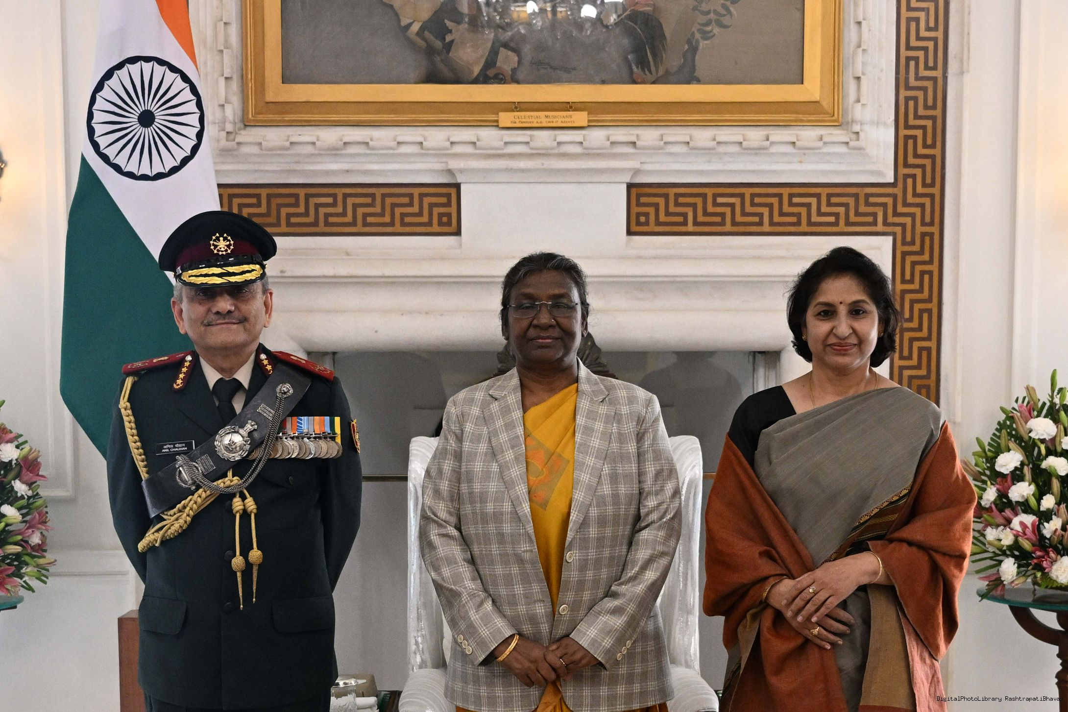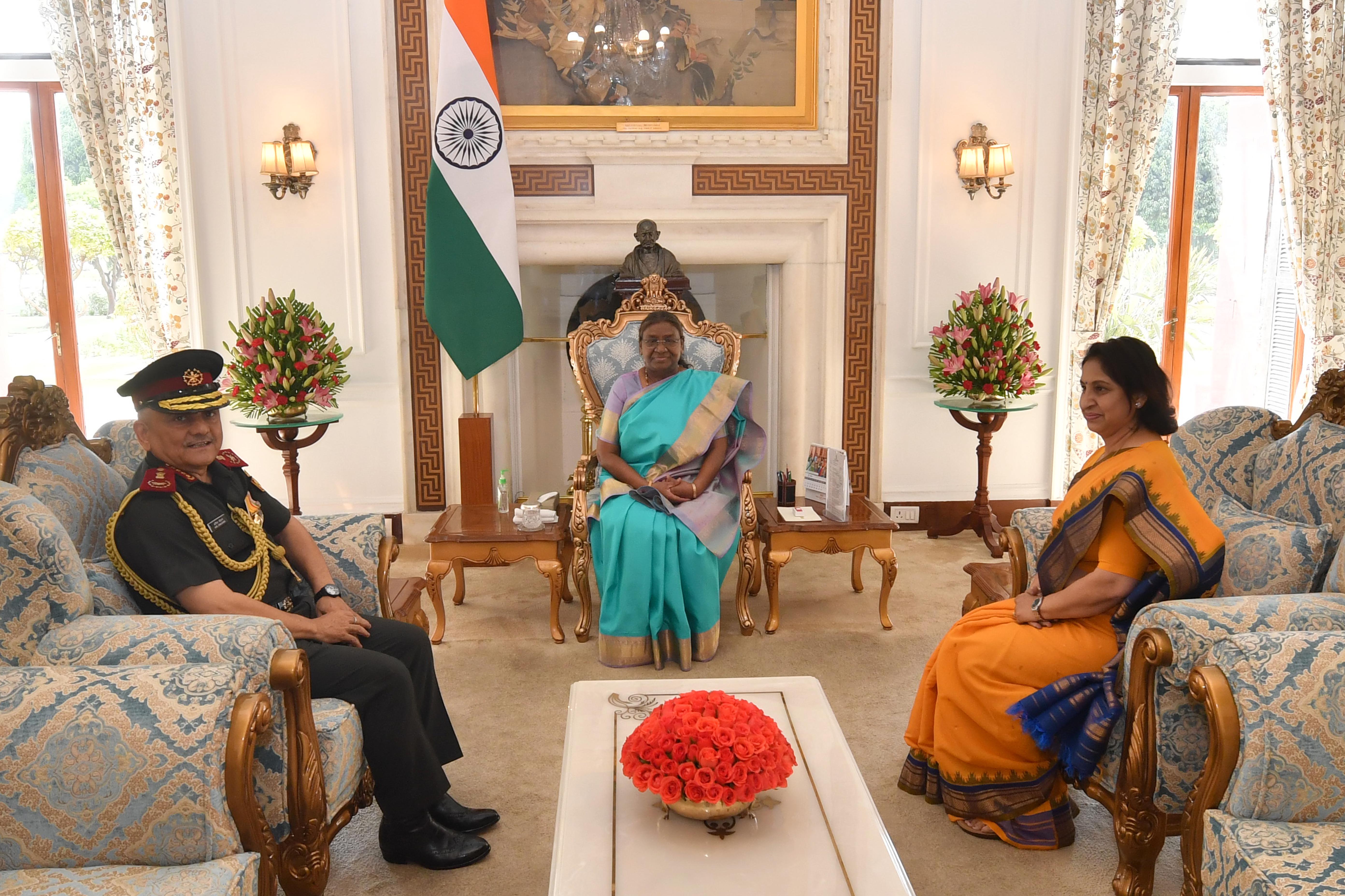 The Chief of Defence Staff and Secretary, Department of Military Affairs, General Anil Chauhan along with his wife Smt. Anupama Chauhan calling on the President of India, Smt. Droupadi Murmu, at Rashtrapati Bhavan on December 20, 2022.