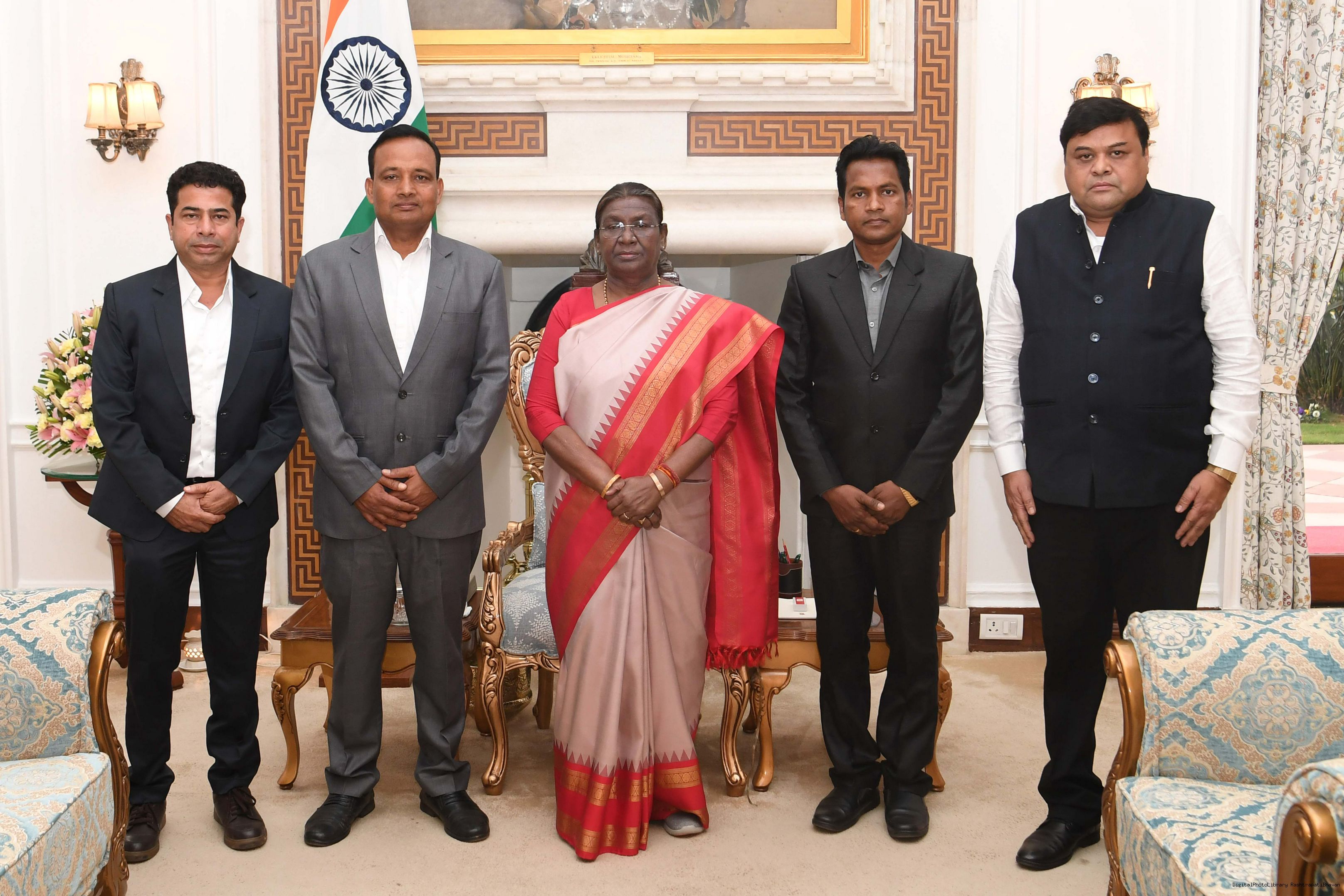 Shri Anil Kumar Sethi, Headmaster, R.N. JIU Govt. High School, Samardafa, PO Bhalubasa, District Mayurbhanj along with others meeting with the President of India Smt Droupadi Murmu at Rashtrapati Bhavan on February 26, 2024.