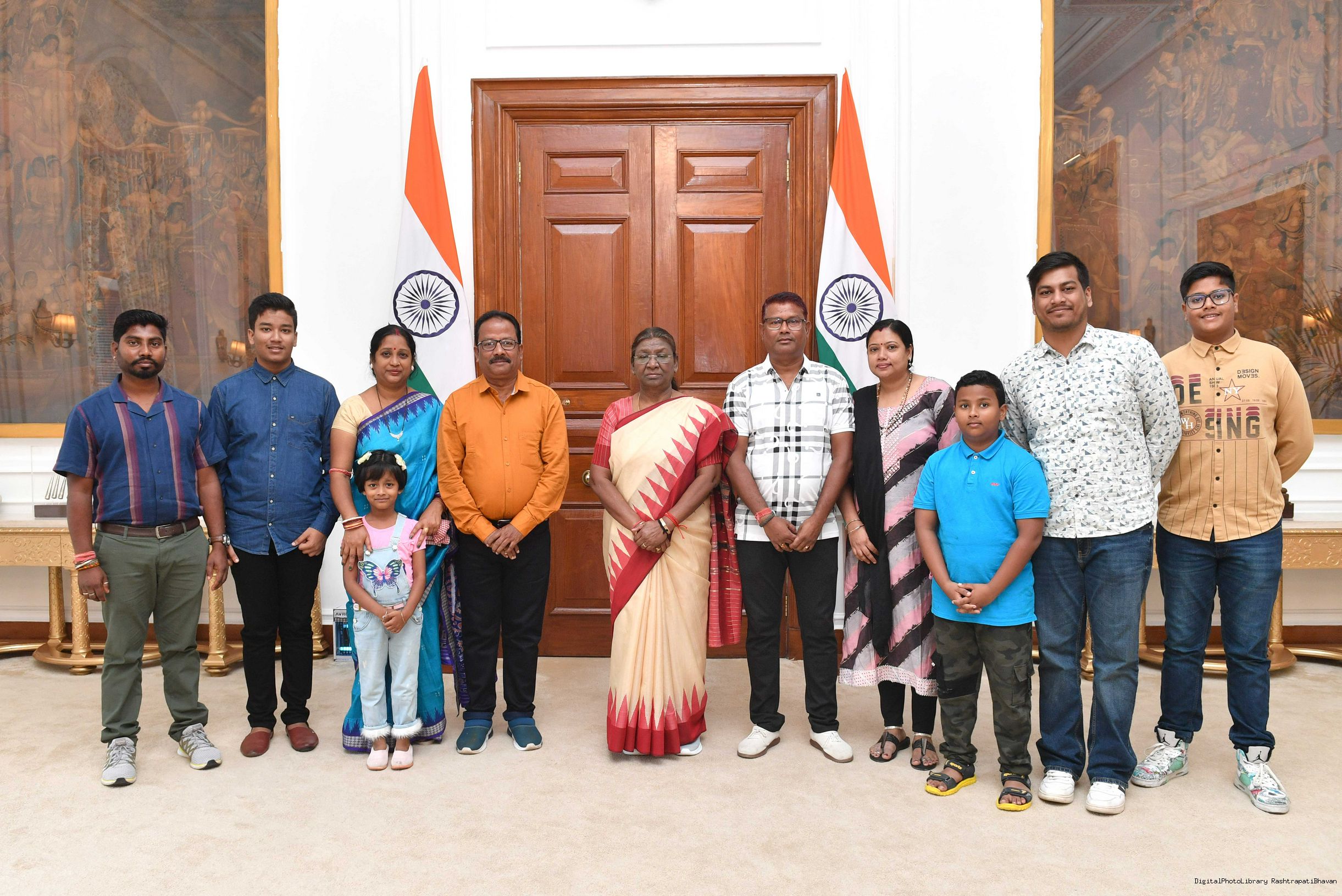 Shri Anurag Kumar Gupta from Rairangpur along with others meeting with the President of India, Smt. Droupadi Murmu at Rashtrapati Bhavan on October 17, 2023.