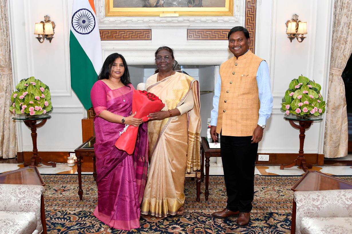 The Union Minister for Tribal Affairs, Shri Arjun Munda along with his wife calling on the President of India, Smt. Droupadi Murmu, at Rashtrapati Bhavan on September 15, 2022.